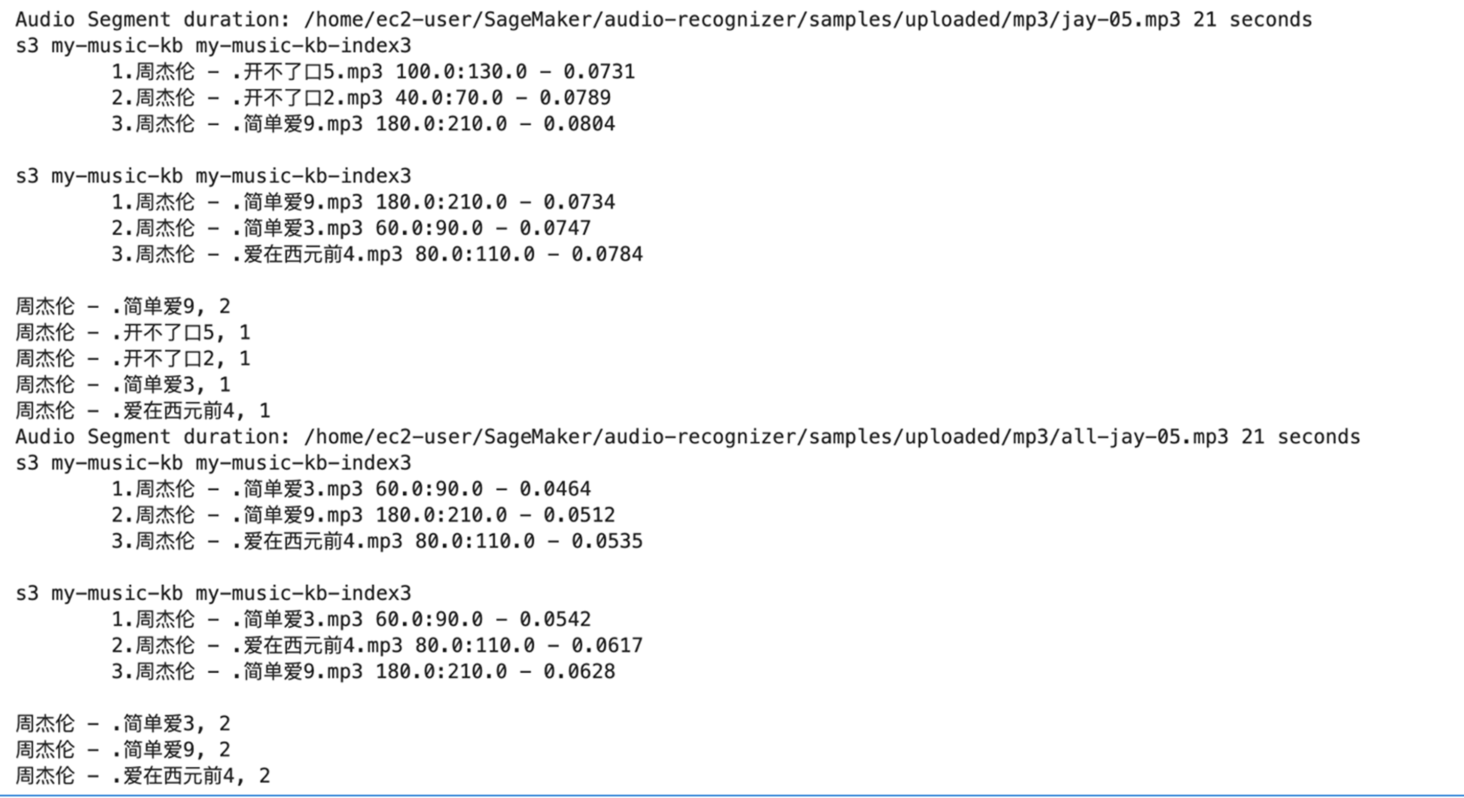 我们上传了两段音频,时常都在15s,一个是直接录制未经过处理的jay-05,另一个是通过ffepeg的降噪提人声处理过的all-jay-05.mp3。可以明显看到,处理过的准确率会明显提高。