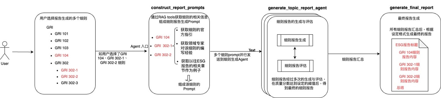 在所有的topic报告生成完成后,将汇总到generate_final_report节点,将各部分智能整合为结构一致、逻辑连贯的完整ESG报告,确保各章节间的衔接自然,数据引用一致,并保持整体风格统一。