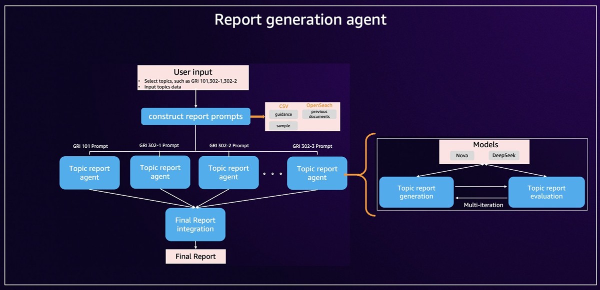 系统接收用户提供的企业ESG相关定量与定性数据,同时通过OpenSearch检索相关标准、最佳实践和历史报告片段,构建丰富的上下文环境。这一步骤确保生成内容符合行业规范且保持企业风格一致性。