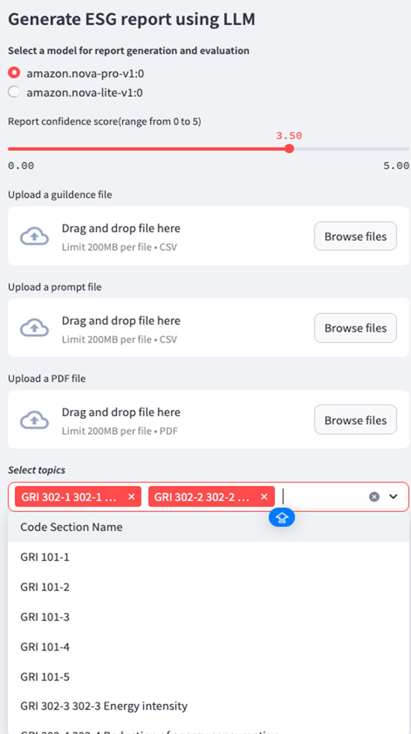 用户通过直观界面选择目标框架、细则项,并设定质量控制参数。系统支持模型切换,便于比较不同LLM在特定ESG主题上的表现差异。