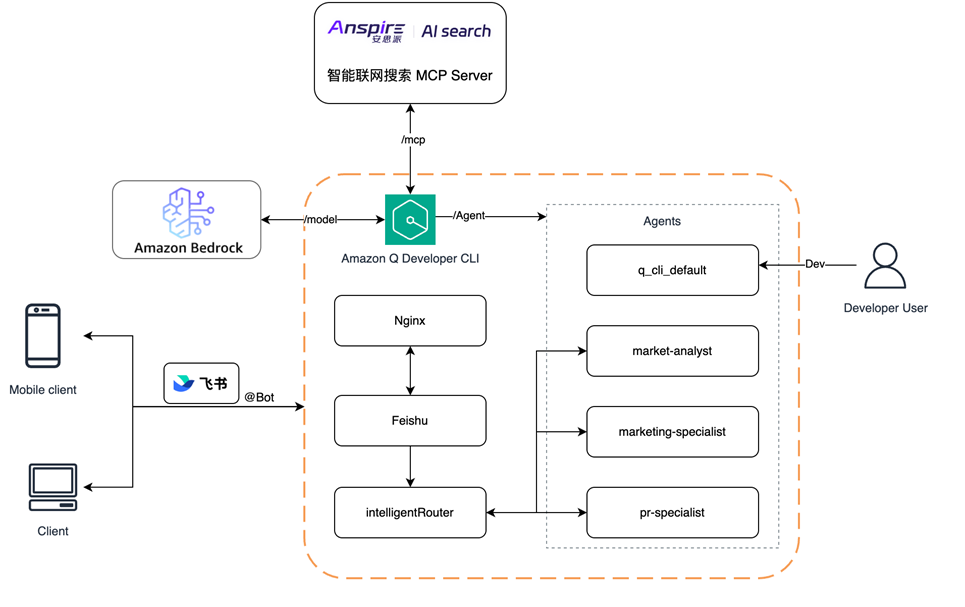 Amazon Q Developer CLI 作为核心控制面,统一调度多智能体(Agents)、外部大模型与知识检索服务。用户可通过 Feishu 等协作平台接入,通过智能路由将请求分发至最合适的 Agent,结合模型生成与联网搜索增强,输出专业化、可信的结果,服务开发者与业务用户。