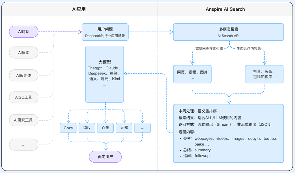 Anspire AI Search为多Agent提供强大语义检索,突破传统关键词搜索瓶颈,提升信息获取和业务洞察质量。 - 与现有生态系统良好集成