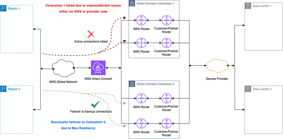 图 1:Direct Connect 接入点故障场景。该图展示流量如何自动从失效的共址设施切换至备用 Direct Connect 接入点,通过地理隔离的路径保持连接。架构在两地部署冗余连接,每地双端口,实现最大弹性。