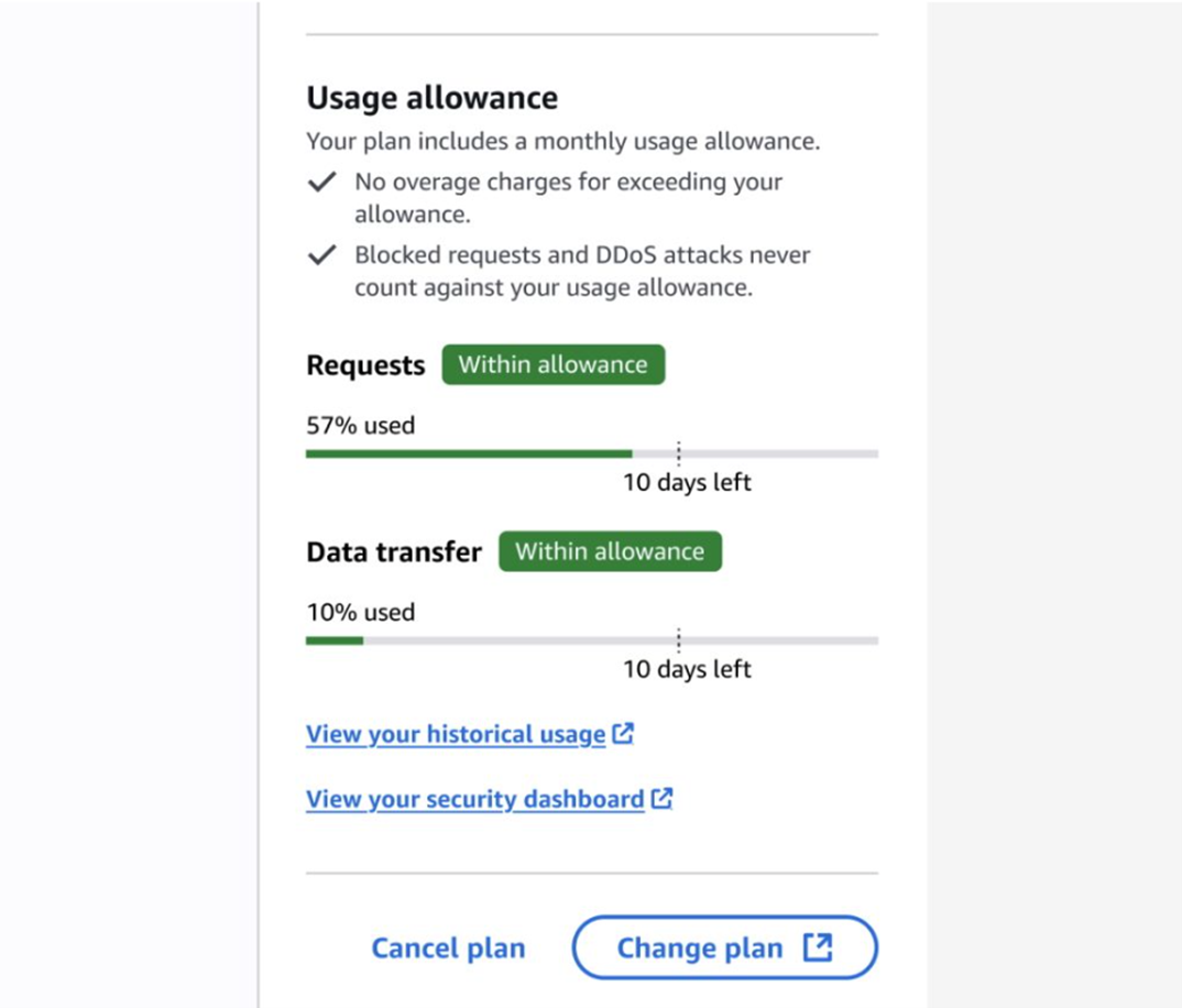 更重要的是,DDoS 攻击所产生的流量不会计入固定月费套餐方案的使用量额度。无论攻击规模大小、持续时间长短,恶意流量均不会消耗您的配额,也不会导致任何额外账单。这意味着,在遭遇攻击时,用户不必担心因恶意流量突增而快速耗尽使用限额,或在关键时刻承担不可预期的成本压力。