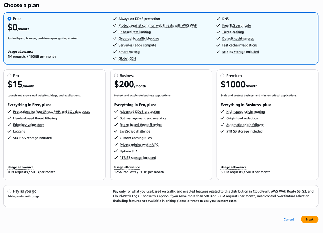 在新的 CloudFront 固定月费套餐方案中,DDoS 防护能力实现了全档位覆盖,无论是 免费版Free、专业版Pro、企业版Business和高级版Premium级别,都具备基础DDoS防护(Always-on),能够在全球边缘节点上持续吸收与缓解网络层攻击流量,确保业务在突发高流量事件下仍能保持稳定运行。这意味着,即使是流量极低的小型项目或个人网站,也能在 Amazon 公有云上安心托管,而不必担心因意外的扫描、探测或流量尖峰导致成本不可控。