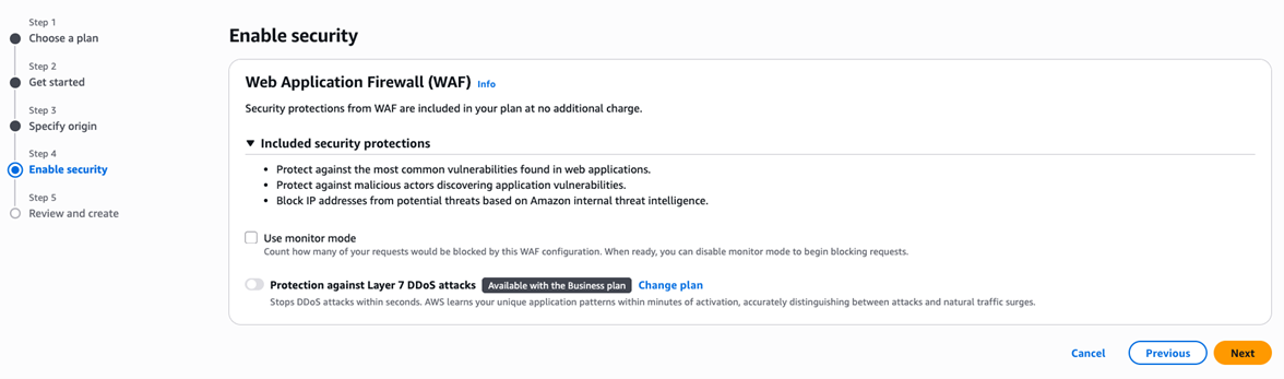 对于需要更强安全性的业务应用,从 Business($200/月)级别起即可获得应用层(L7)DDoS 防护能力,依托 AWS WAF 的规则引擎实现高级恶意流量识别、威胁拦截与异常行为检测,有效缓解面向应用的攻击压力。借助 CloudFront 全球分布式边缘架构,用户无需额外购买独立高防产品,即可在访问入口处实现始终在线、自动扩展的企业级防护。