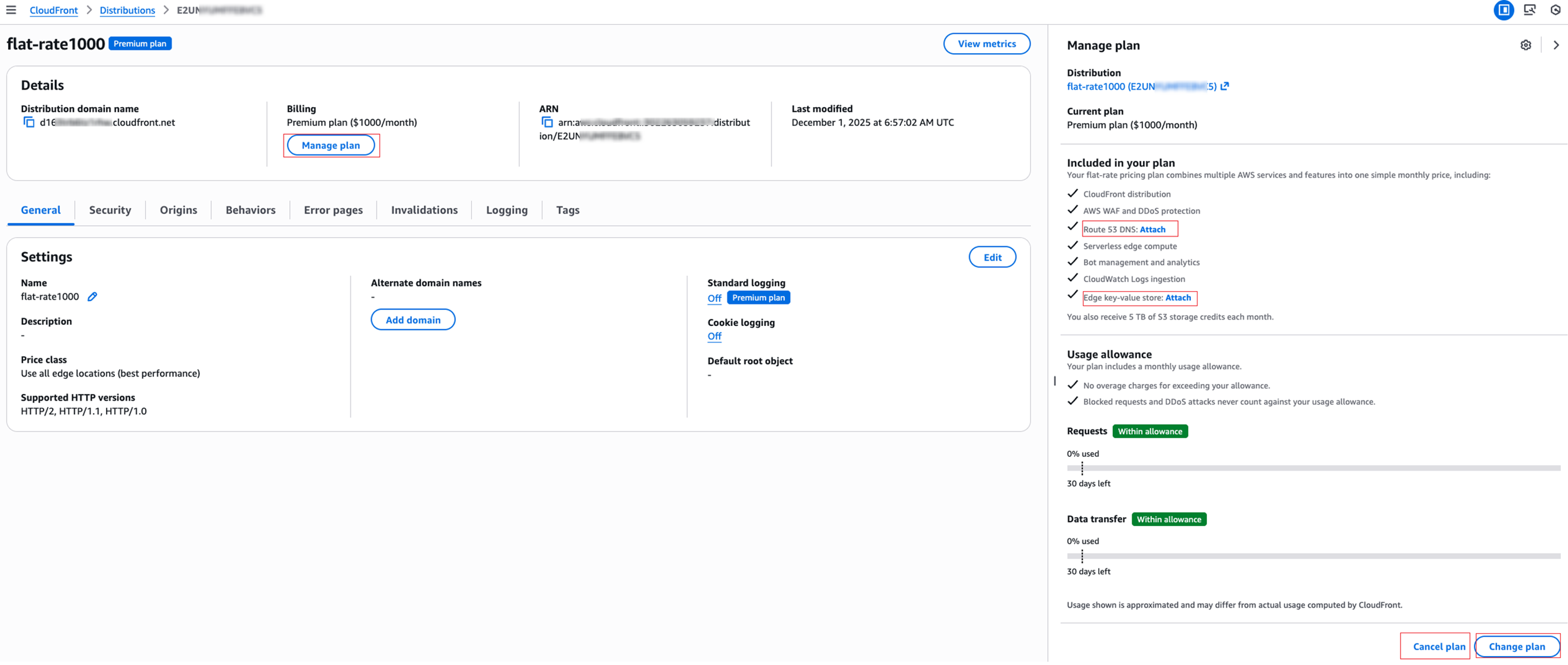 用户可以把与这个CloudFront分发相关的Route53 Host zone和Key value store在当前页面关联到这个CloudFront分发(Distribution),从而享受Flat-rate的固定月费套餐计划的覆盖。