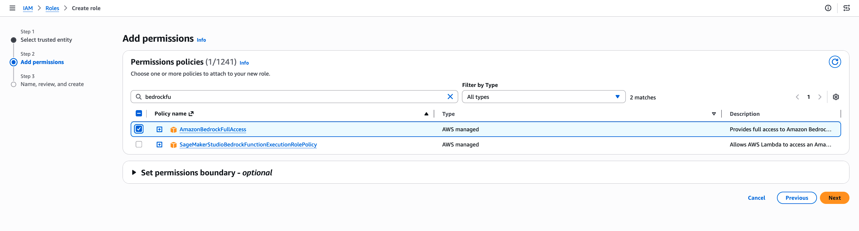 在 Permissions policies(权限策略)下,选择 AmazonBedrockFullAccess