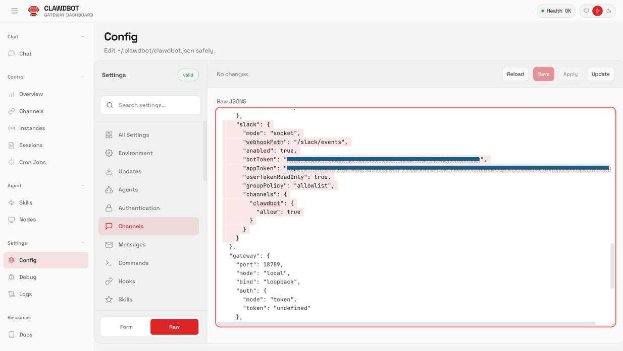 浏览器打开http://localhost:18789/?token=<在前面设置好的gateway token>,Settings > Config > Channel, 选择Raw配置模式,在json配置文件里插入下列配置,点击Save,然后Reload