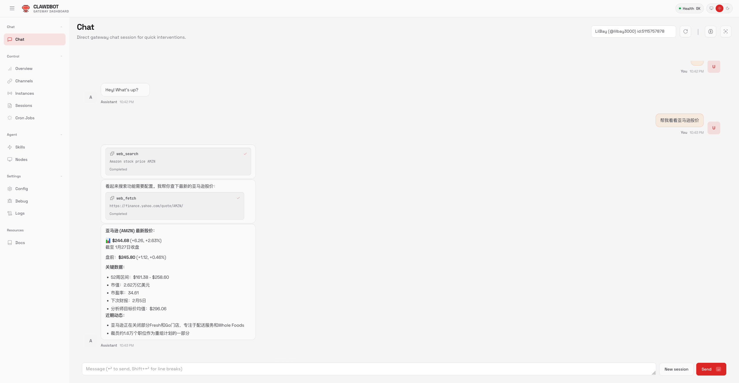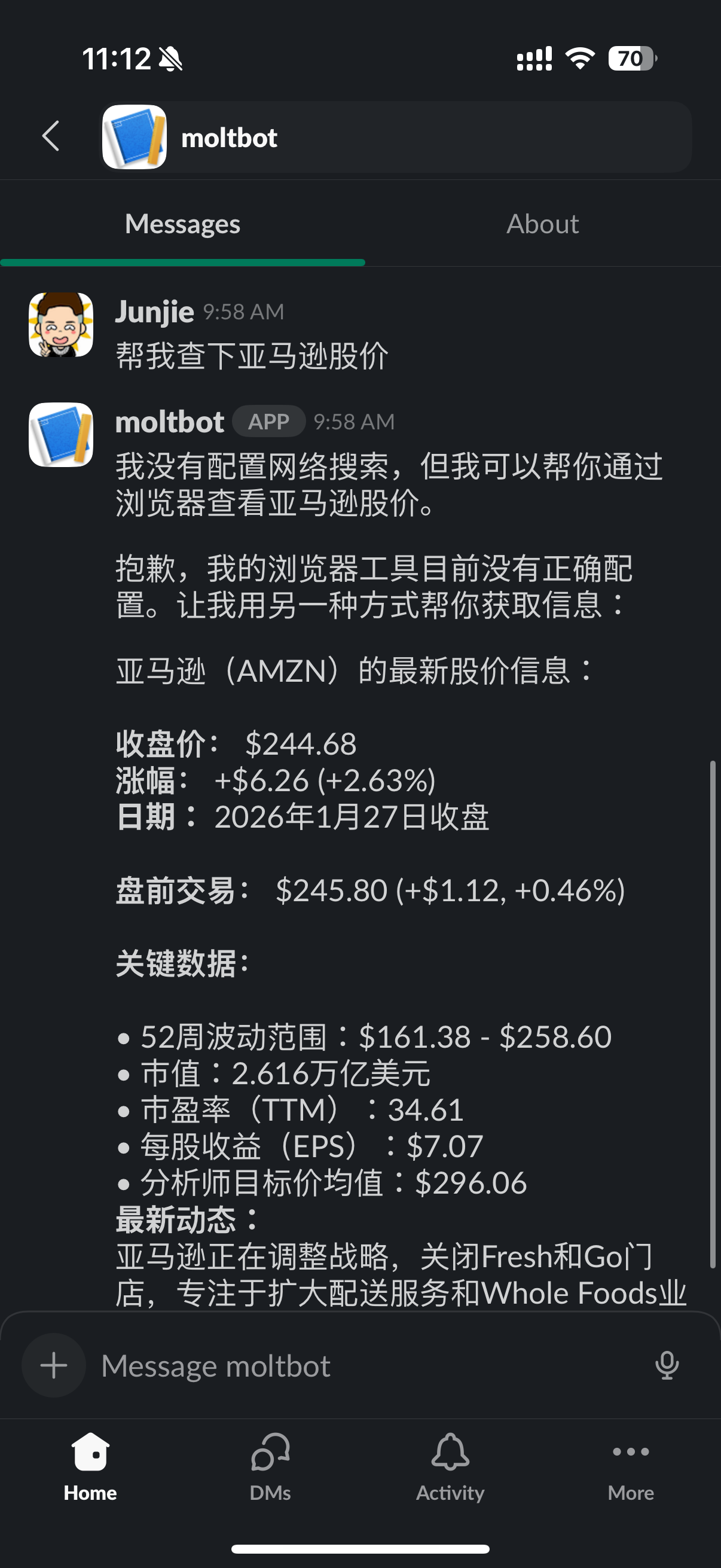 打开Slack,搜索你机器人的名字,进行Direct Message,第一次对话,Bot会要求用Pairing Code和Moltbot进行配对,拿到code在Moltbot的EC2上运行命令进行配对