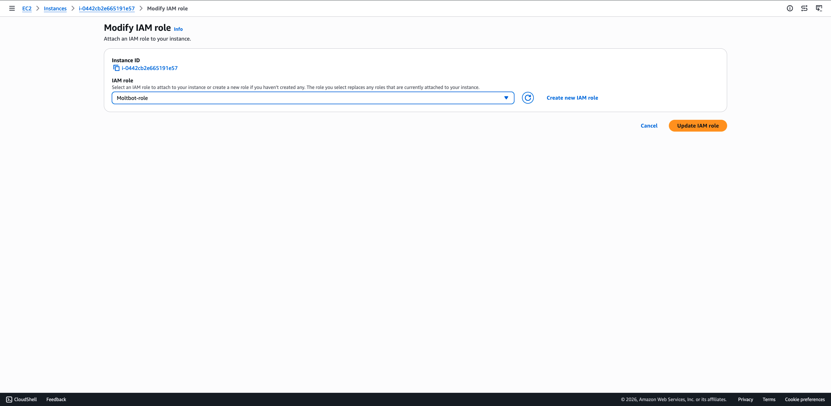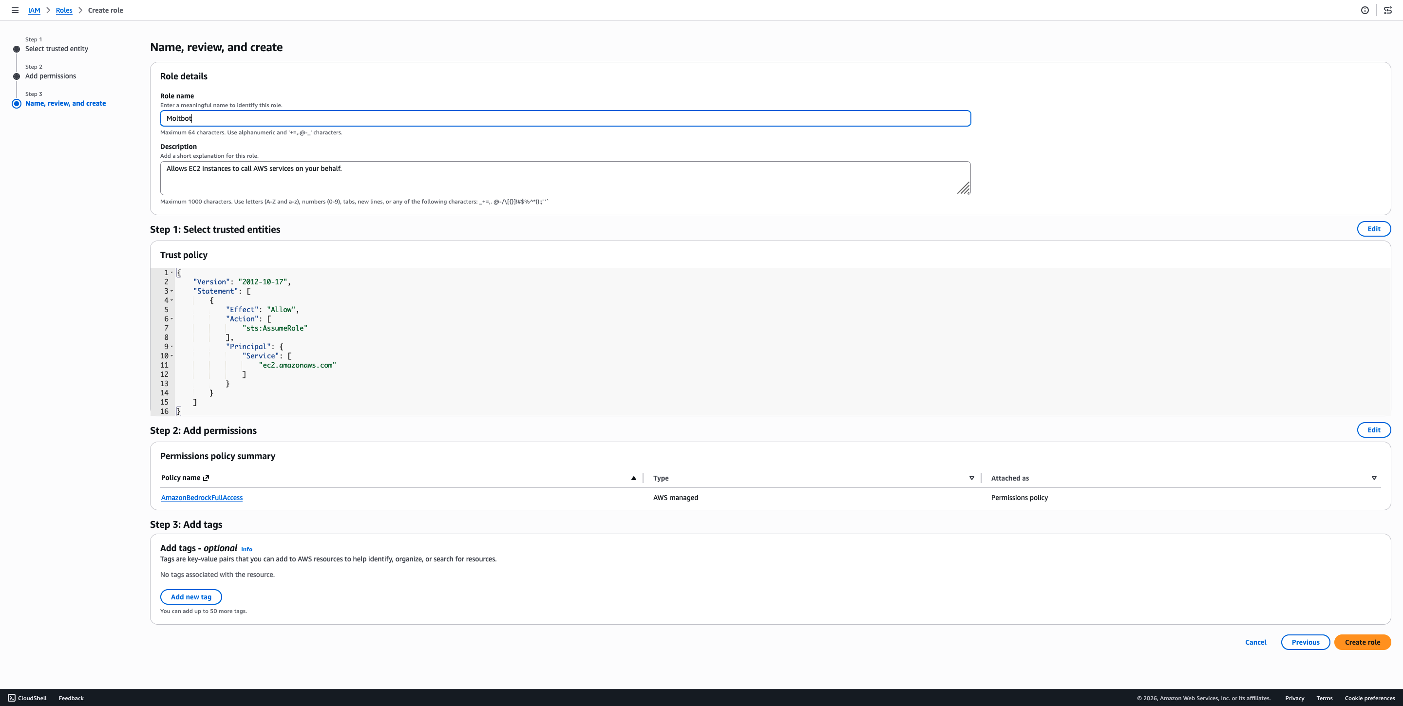 Role name填写MoltBot,其他保持默认配置,点击 Create role(创建用户)