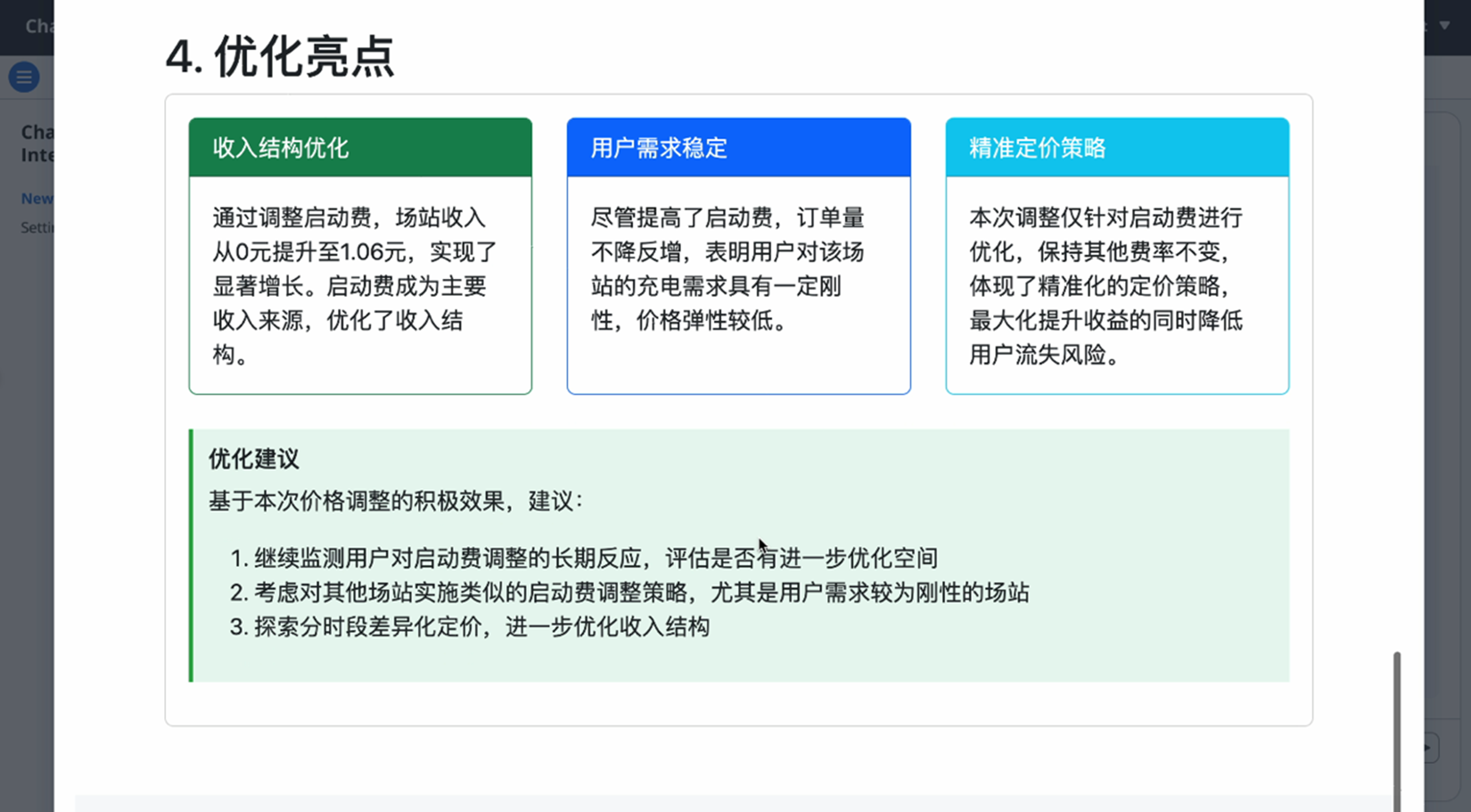 基于收集到的多维度数据,系统生成了一份详尽的智能定价分析报告。该报告展示站点的地理位置特征、历史使用模式、设备状态、电力成本变化等多个维度的信息。通过大模型识别用户行为规律,预测不同时段的需求波动,并结合外部市场因素进行风险评估。这一过程体现了Agentic AI的核心优势——能够处理人类难以同时考虑的多重复杂因素。