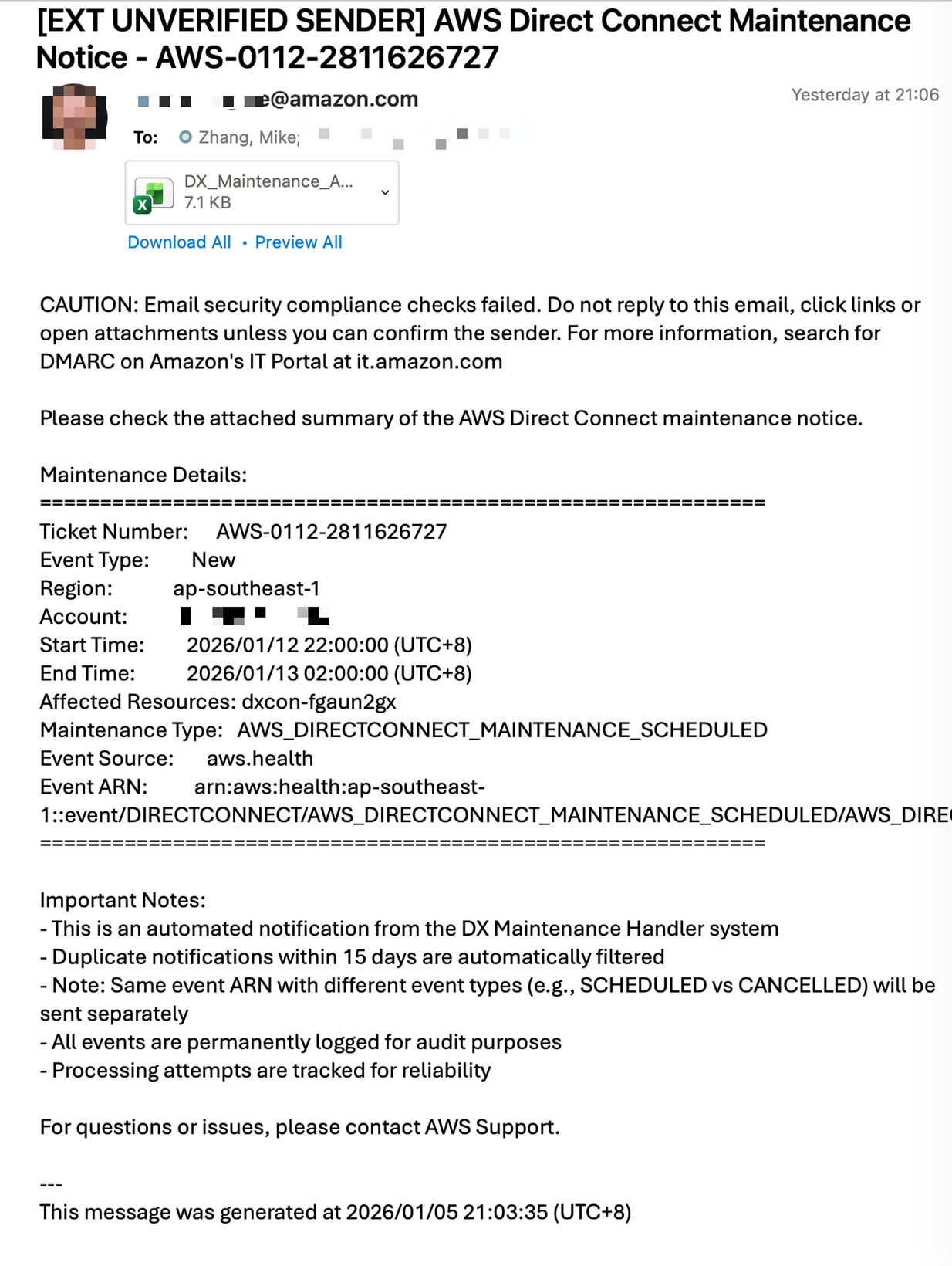 “我们的网管系统只能接收和处理带 Excel 附件的邮件,AWS PHD(Personal Health Dashboard) 只会发送纯文本/HTML 邮件,不符合要求。”