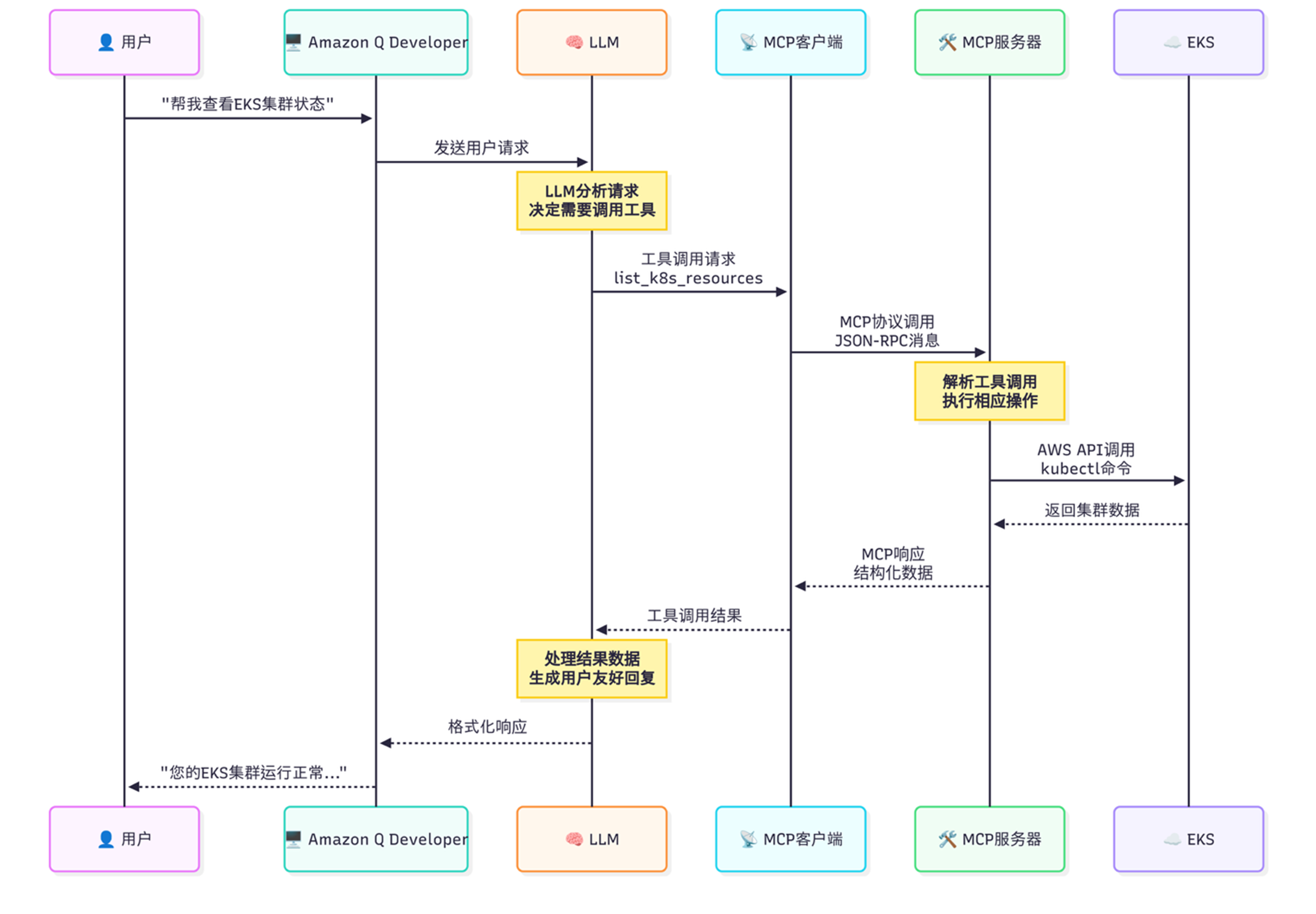 EKS MCP Server的模块化设计确保了高度的可扩展性和可维护性,使系统能够适应不断变化的需求和环境。同时,其标准化的接口使Amazon Q能够通过自然语言理解用户意图,并将其转化为适当的Kubernetes操作,极大地简化了集群管理流程。让我们以以”查看EKS集群状态”为例,展示Amazon Q Developer CLI、LLM、MCP协议与EKS服务之间的完整交互流程和数据传递过程。