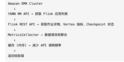 Amazon EMR(Elastic MapReduce)是 AWS 提供的托管大数据平台,支持 Flink、Spark、Hadoop 等框架。本系统监控运行在 EMR 上的 Flink 作业,通过以下 API 收集指标: