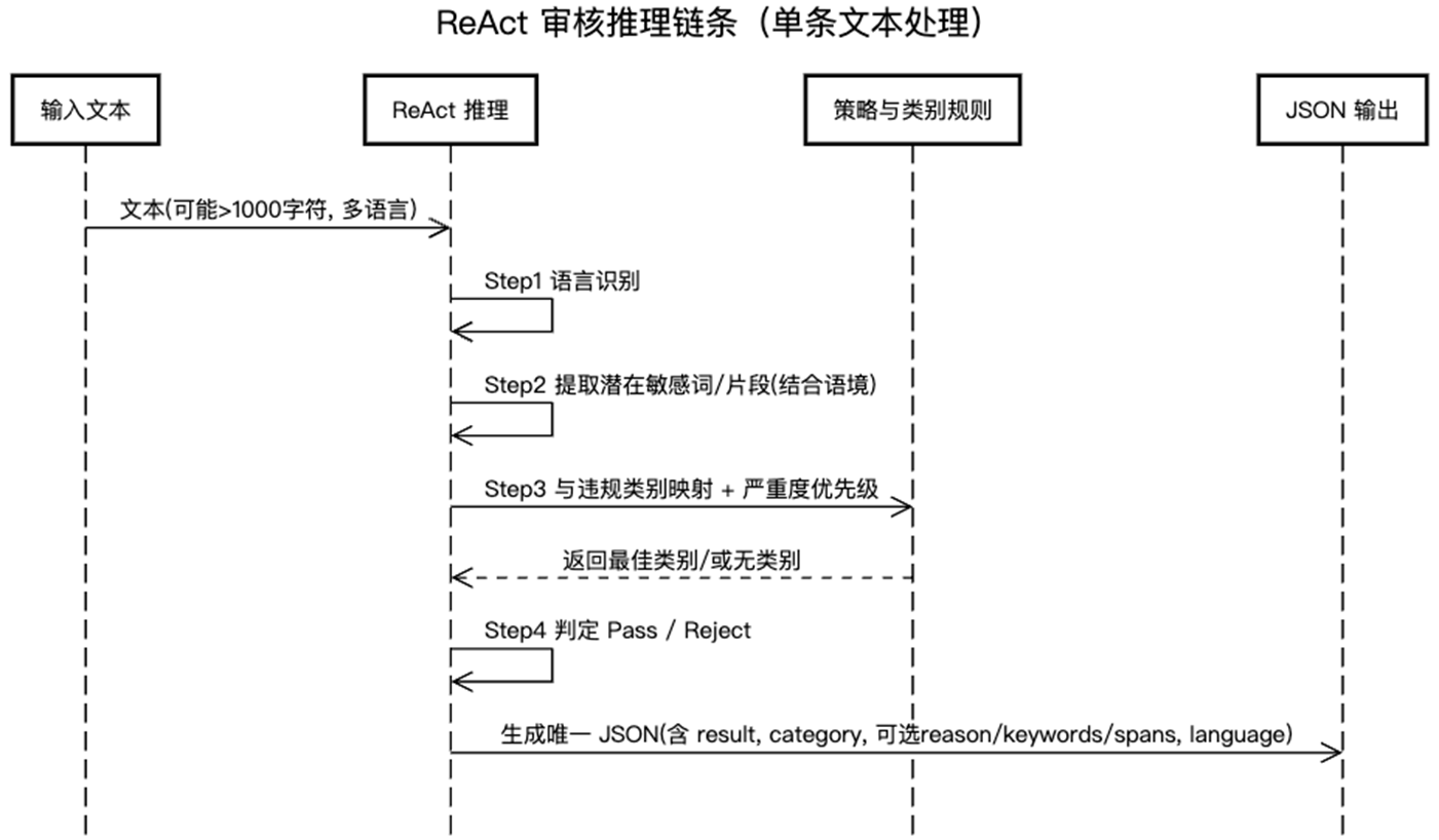 注入样本正文。 - 建议:模板内统一约束唯一 JSON 输出,便于解析;输出前置 ReAct 步骤(语言识别、关键词提取、类别匹配、最终判定)。