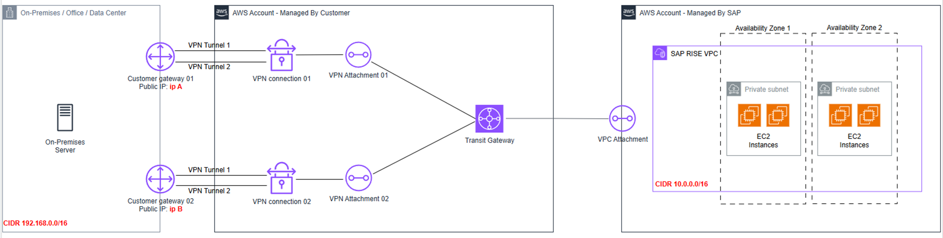 方案基于 Amazon Site-to-site VPN 和 Amazon Transit Gateway 实现。由于在 Amazon 云端部署的 SAP 采用了 RISE with SAP 方案,而客户没有 SAP RISE 账号的管理权,因此客户注册了自己的Amazon 账号以使用上述服务来建立链路。