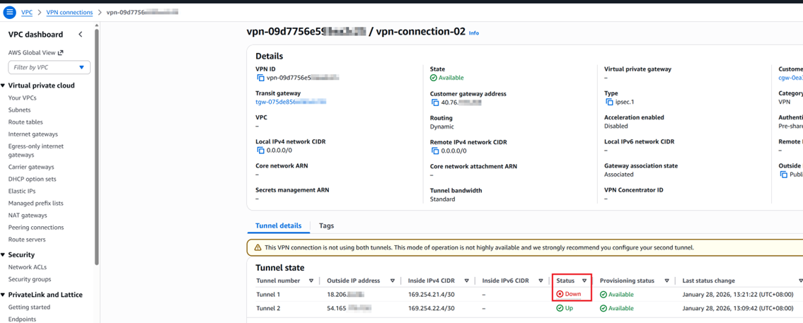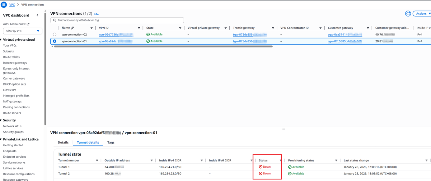 Amazon 上其中的一个 Site-to-Site VPN Connection 下的两条 VPN Tunnel,随后显示都 down 掉了。