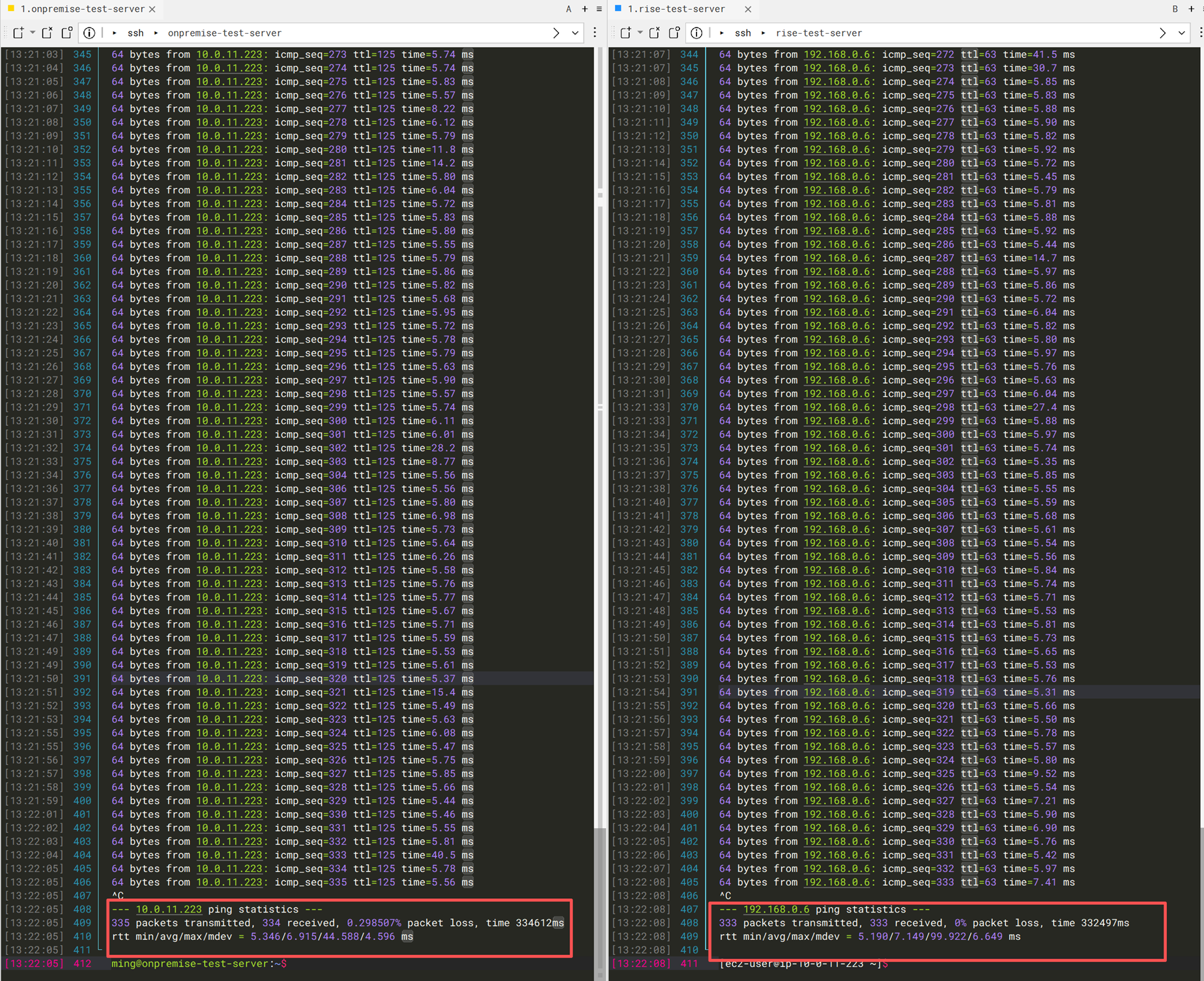 - on-premises 环境(左)和 SAP RISE VPC (右)内的两台机器互 ping,可见连通性正常。
