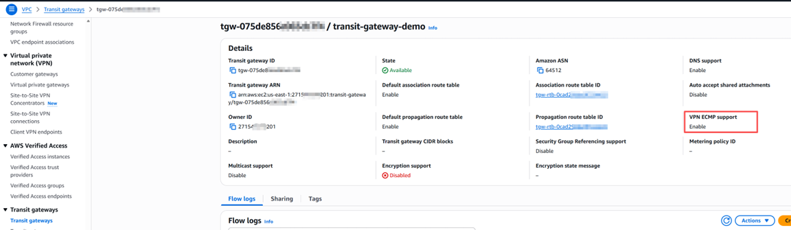 - 这一步需要保证,IPSec VPN 网关上对所有 Site-to-Site VPN Tunnel 的流量执行了 ECMP,并且所有向 Amazon 通告的 BGP 路由的 AS-Path 等于 on-premises 环境的 BGP Local ASN 即 65000。参考 https://repost.aws/knowledge-center/transit-gateway-ecmp-multiple-tunnels