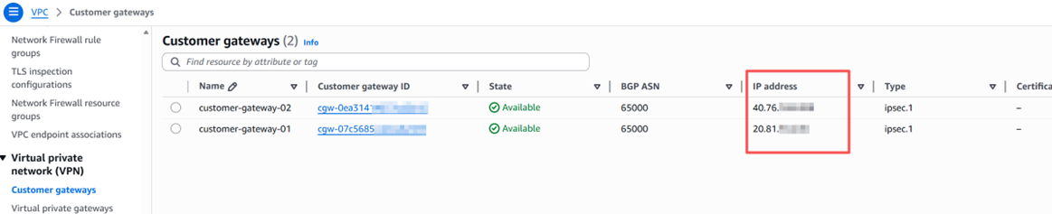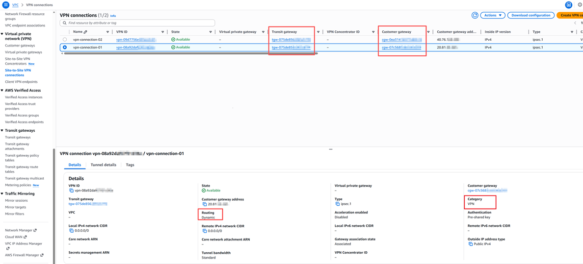 4、稍等几分钟以后,会看到 Amazon 自动创建了两个 Site-to-Site VPN Connection,对应上一步的两个 VPN attachment