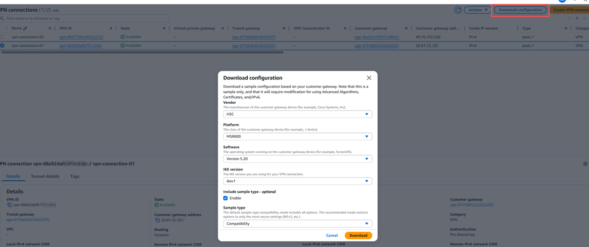 5、在 Site-to-Site VPN Connection 详情页面选择 “Download Configuration”,有多个设备厂商的配置模板可供下载。配置模板中含有 IPSec、BGP 相关配置参数。
