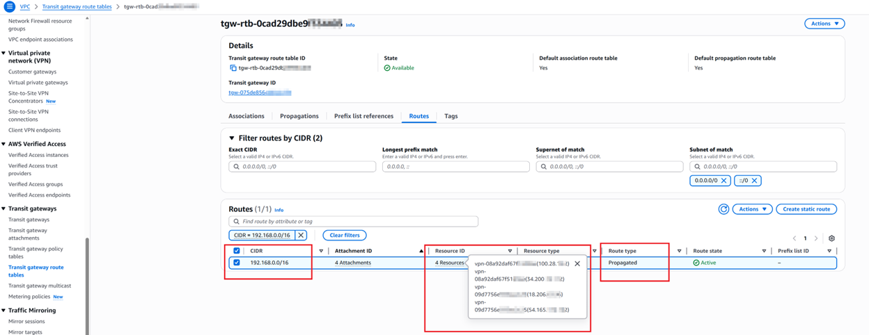 - 并且transit gateway 也自动学习到了 on-premises 环境的路由(168.0.0./16)。