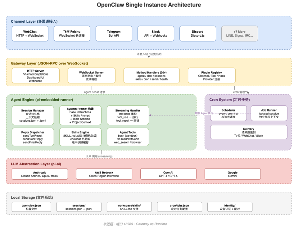 一个 OpenClaw 实例是一个单进程(node openclaw.mjs gateway,端口 18789),内含五个层次: