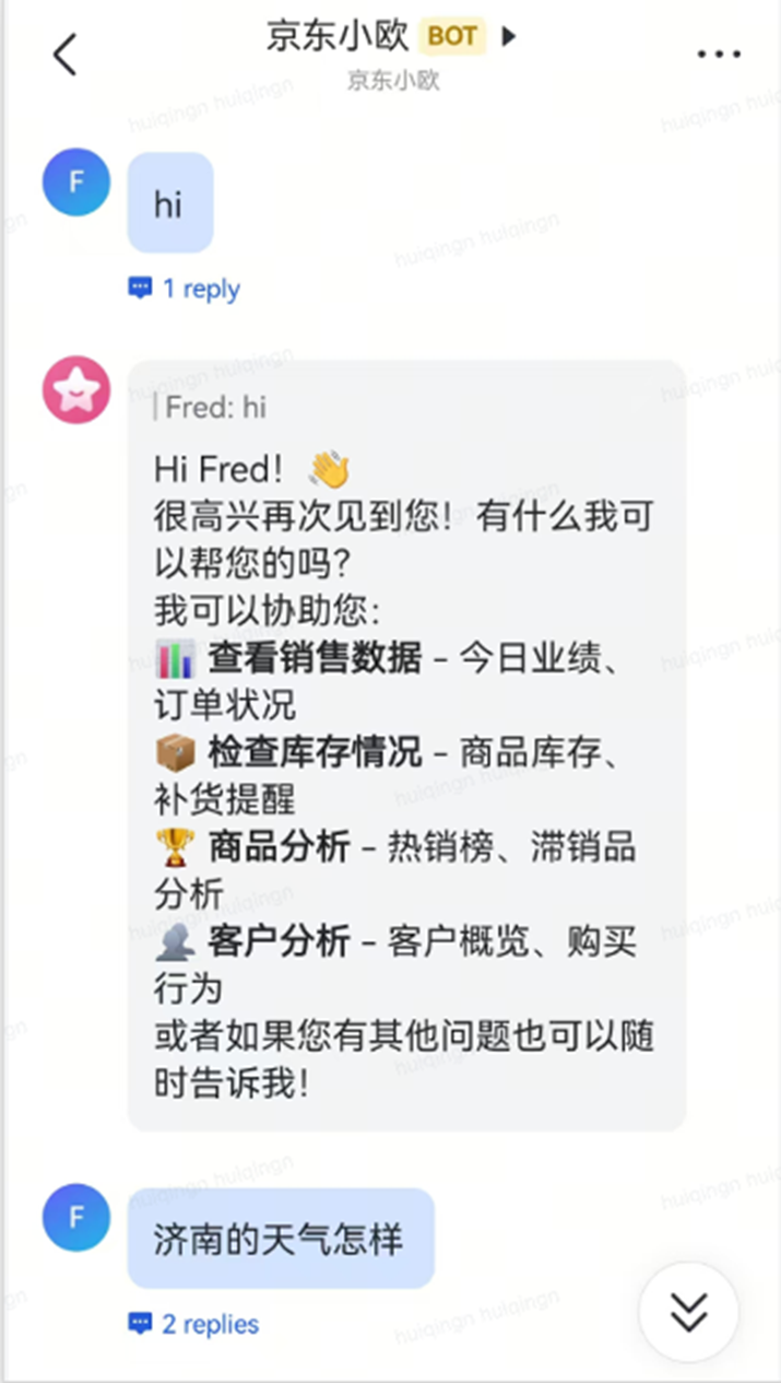 以下是实际 PoC 中的几个使用场景。(测试中将Bot命名为“京东小欧”仅为POC随意命名)