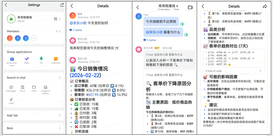 模拟三个店员和bot建群,通过@方式让Bot进行销售情况查询和分析