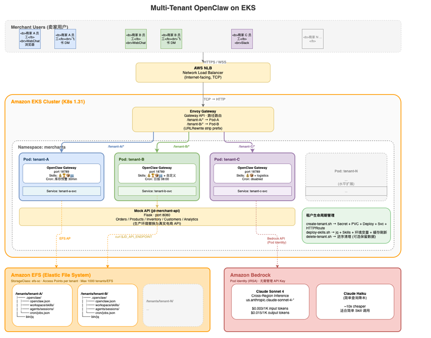 多租户场景下的局限:每个 Pod 的 session 文件是独立的,Gateway API 只能查本 Pod 内的数据。如果要在平台级为商家提供审计能力,需要在 OpenClaw 之外建设日志汇聚层——例如将每个 Pod 的 EFS 目录中的 .jsonl 文件通过 Fluent Bit 采集到 CloudWatch Logs 或 OpenSearch,再为每个卖家提供查询、告警和合规检查。