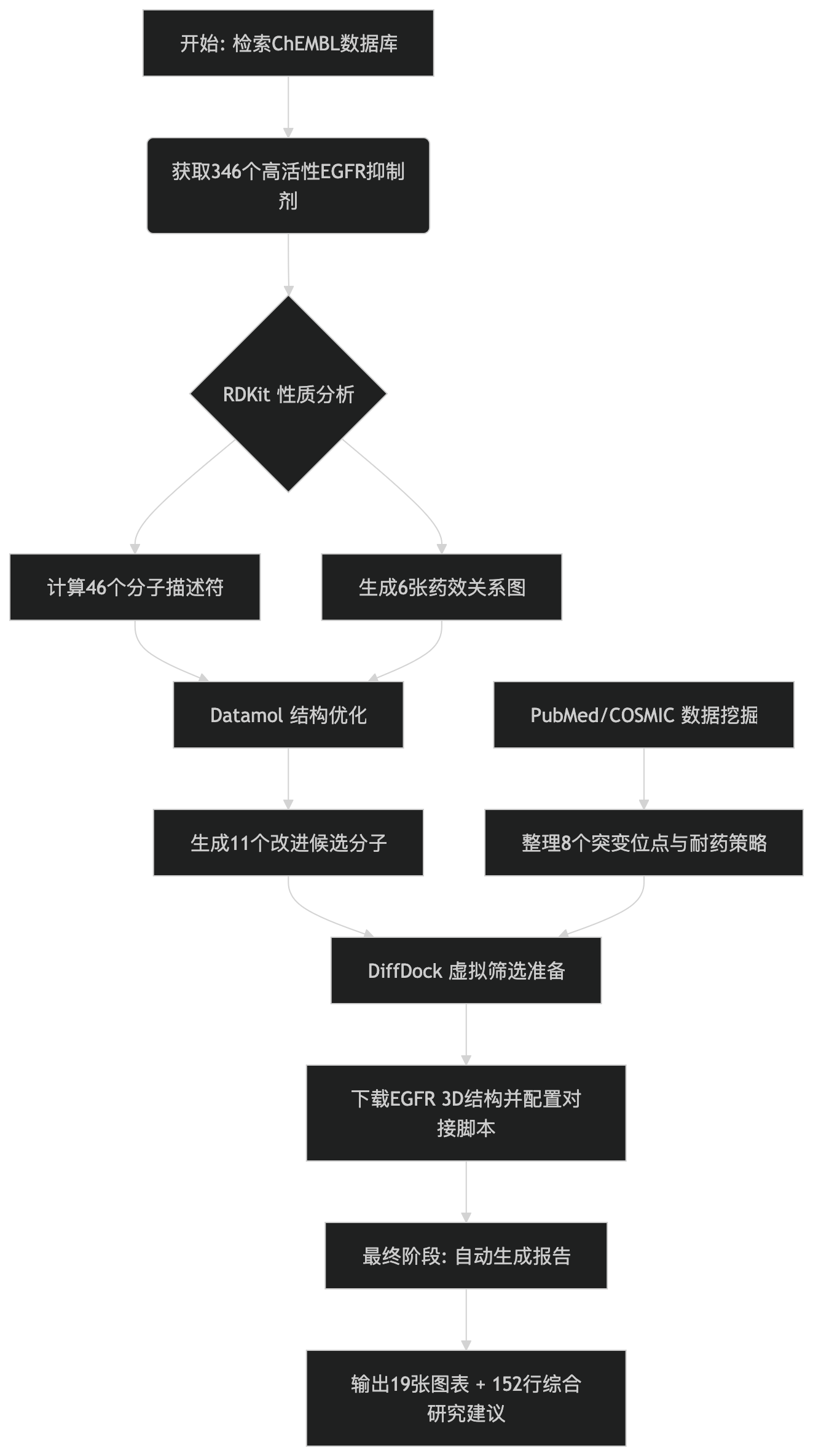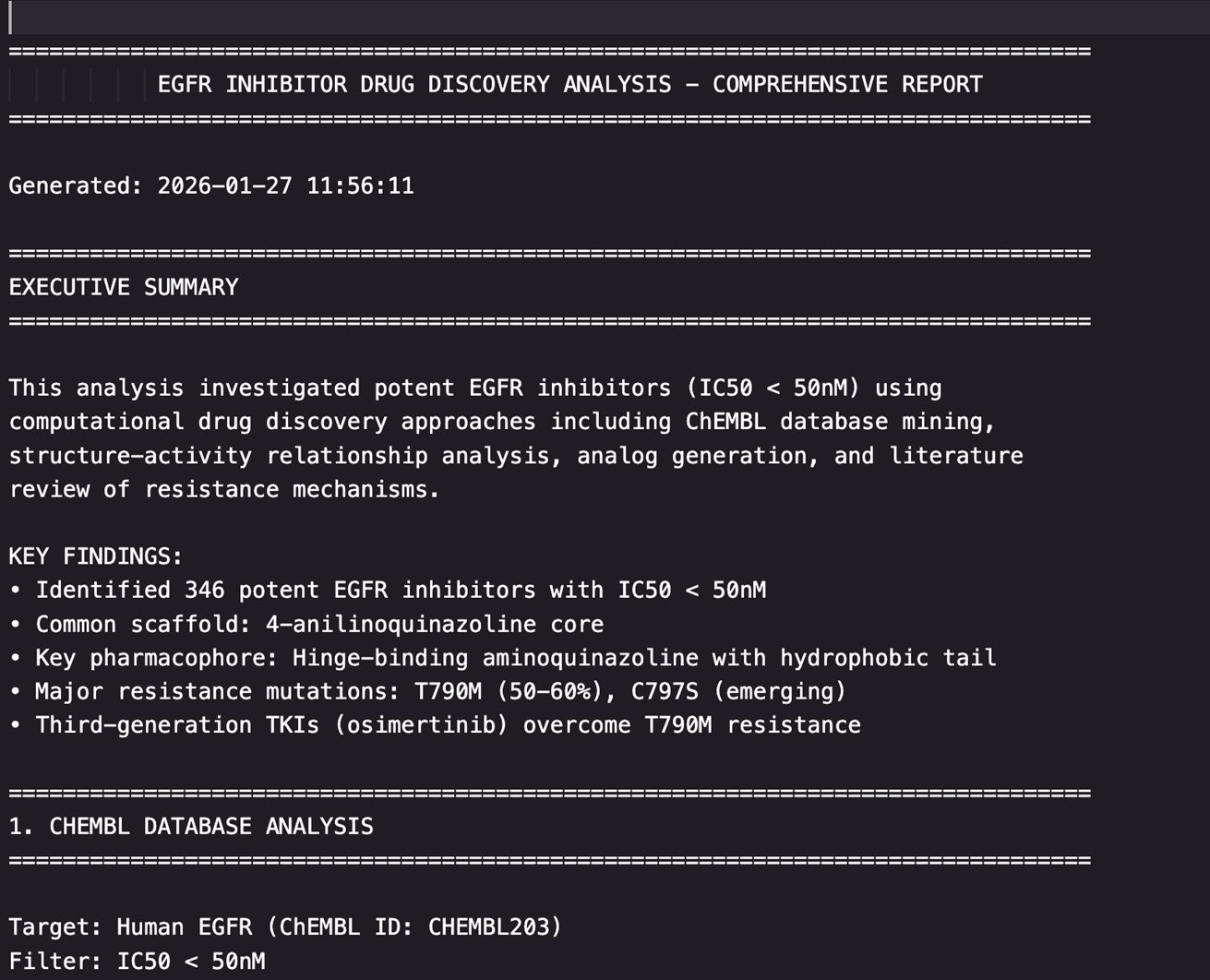 "尽可能使用你能访问的所有技能。从ChEMBL查询EGFR抑制剂(IC50 < 50nM),用RDKit分析构效关系,用datamol生成改进的类似物,用DiffDock针对AlphaFold的EGFR结构进行虚拟筛选,在PubMed搜索耐药机制,检查COSMIC数据库中的突变,并创建可视化图表和综合报告。"