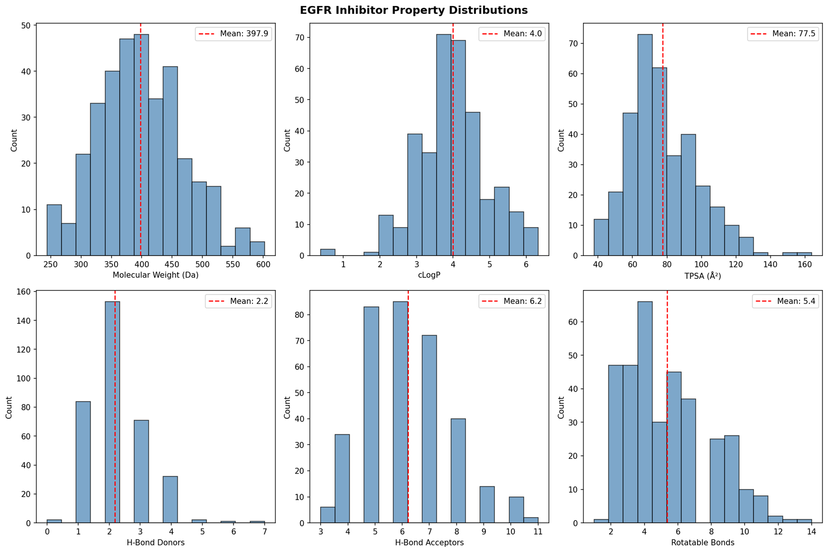 - cLogP(脂溶性):平均4.0,峰值在3.5-4.0区间,表明这些化合物具有适中的膜透过性