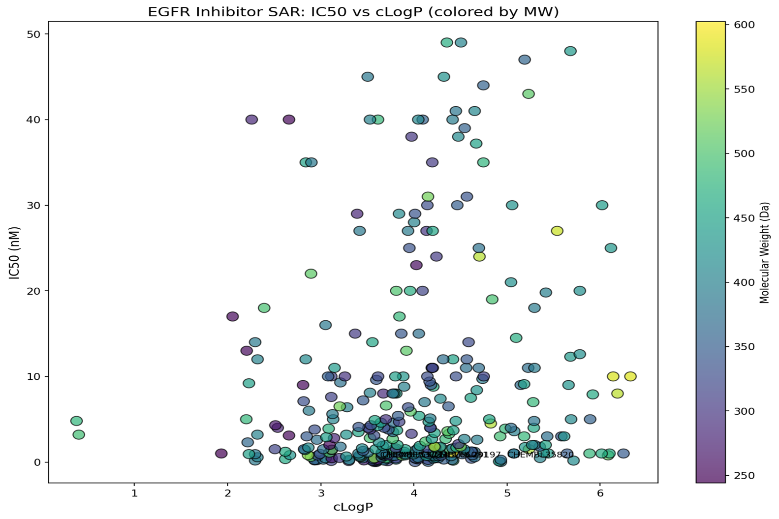 - 分子量(颜色编码)显示:较大分子(500-600 Da,黄绿色)倾向于具有更高cLogP,但不一定更高活性