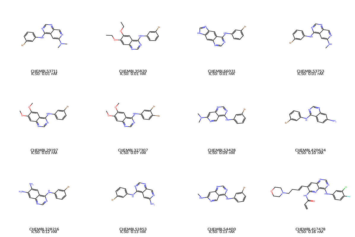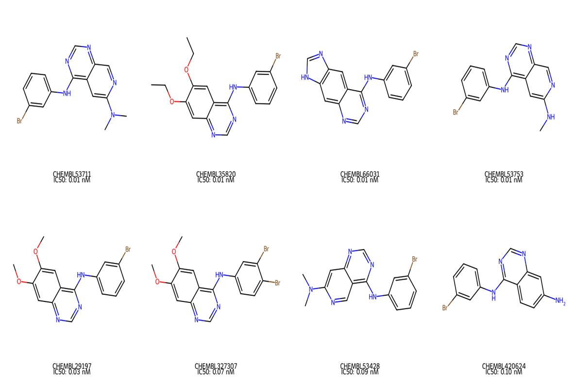 - 最高活性化合物(CHEMBL53711、CHEMBL35820等)的IC50值接近picomolar级别(0.006-0.01 nM),这意味着它们在极低浓度下就能抑制EGFR活性。