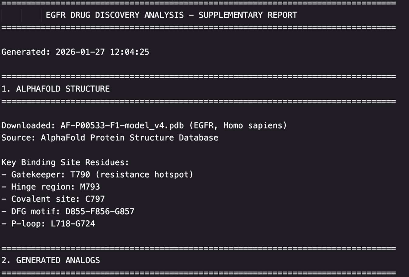2.补充报告(supplementary_report.txt):82行,记录AlphaFold结构、生成类似物参数和文献检索策略