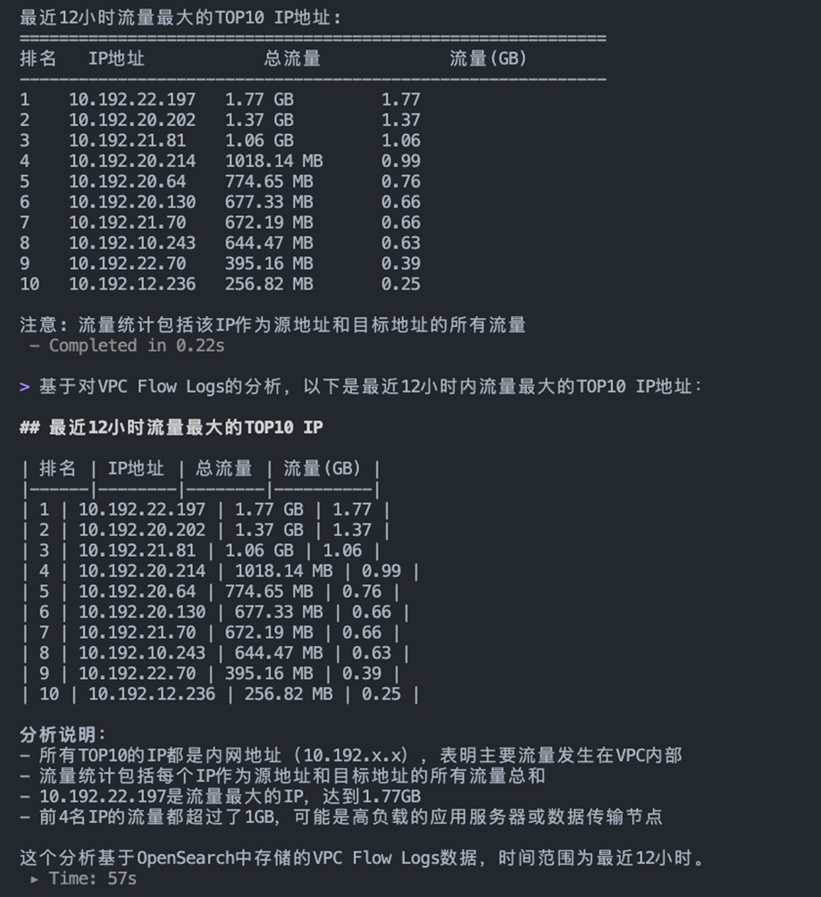 日志分析是 OpenSearch 最常见的应用场景之一。传统方式下,运维人员需要掌握复杂的查询语法和聚合函数,才能从海量日志中提取有价值的信息。即使对于有经验的工程师,编写高效的查询语句也常常是一项挑战,更不用说理解查询结果并提炼出关键洞察。下面,我们通过分析 VPC Flow logs 的例子展示 Kiro CLI 与 OpenSearch MCP Server 如何简化日志分析流程。在 OpenSearch 集群中已接入 VPC Flow logs,我们只需通过自然语言方式提问:“从 vpc flow logs 帮我分析最近 12个小时,流量最大的 TOP 10 IP。” 如下示例,Kiro 开始调用 OpenSearch MCP Server 中的 Tool 来帮我们查询 Flow log 日志内容,并且根据查询获得的数据生成最终的结果。