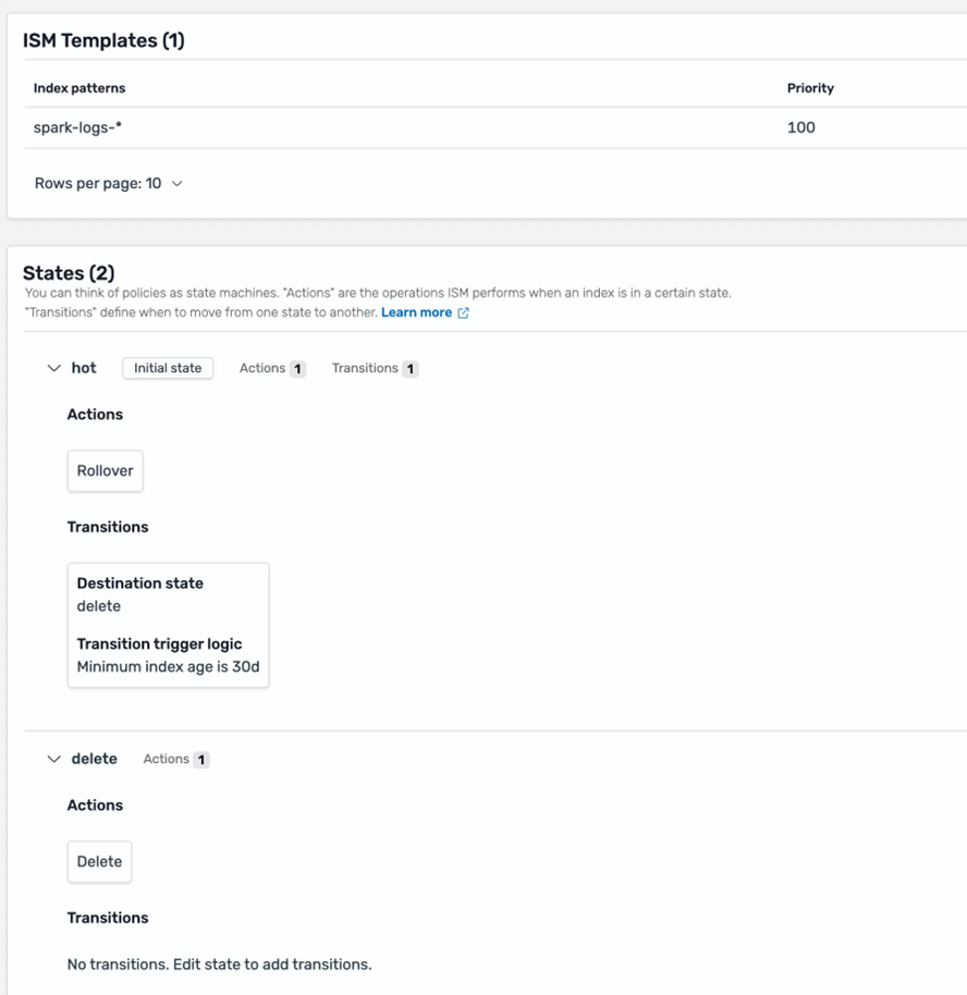 5. 回到 OpenSearch Dashboard UI,进入到 ISM 中,可以看到一个名为 spark-logs-policy策略已经创建成功
