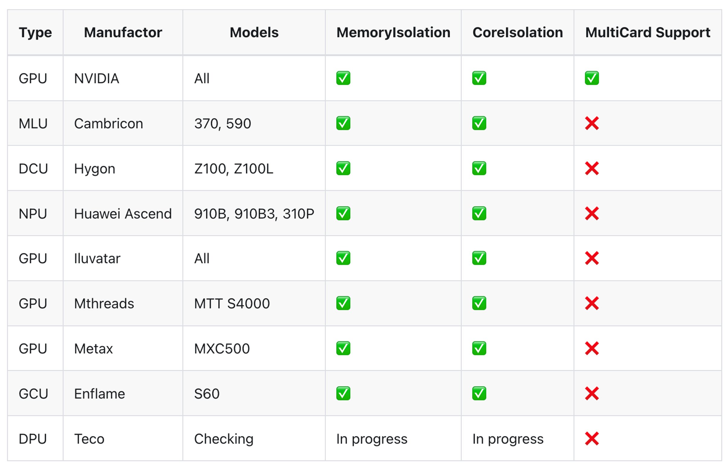 如下表格是HAMi对支持的Device类型及隔离能力的说明https://project-hami.io/docs/userguide/device-supported/。从该表格可以初步评估,HAMi可以满足对Nvidia GPU资源的内存隔离、核心隔离和多卡支持。