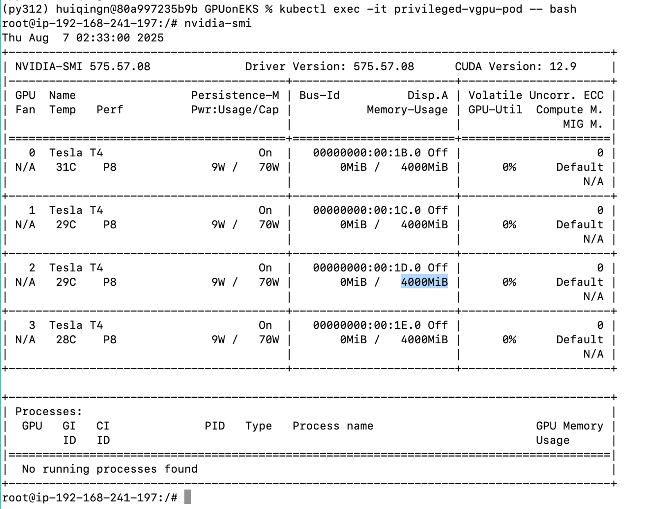 进入一个Pod后查看GPU资源占用情况,验证每GPU上申请到4GB显存。