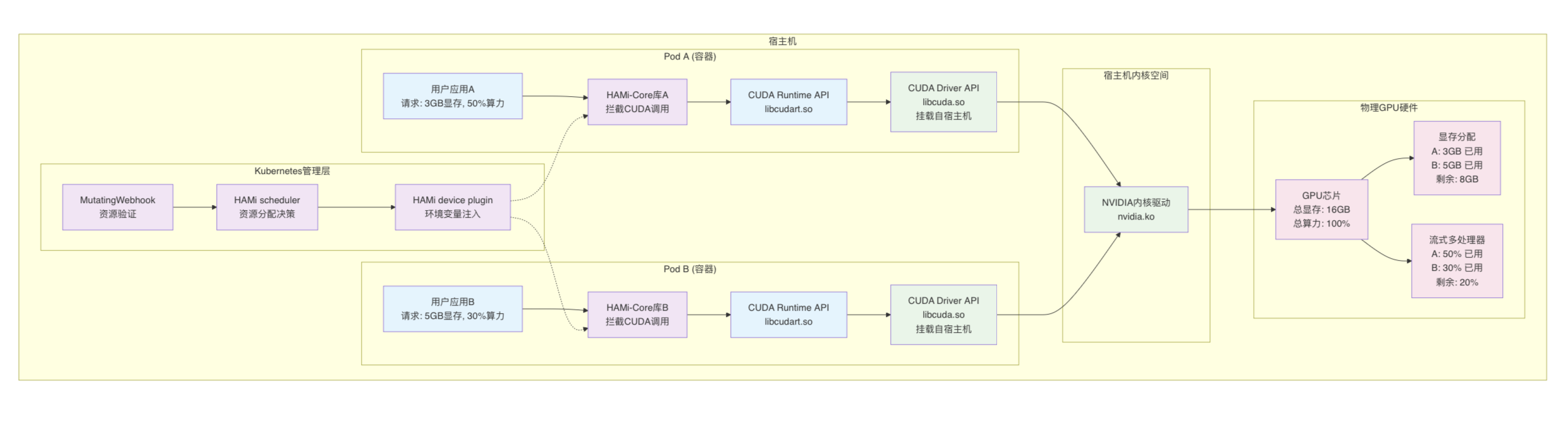 - 资源校验:HAMi Core 会读取 Pod 下发的 GPU 配置(例如显存上限),检查本次申请是否超限。