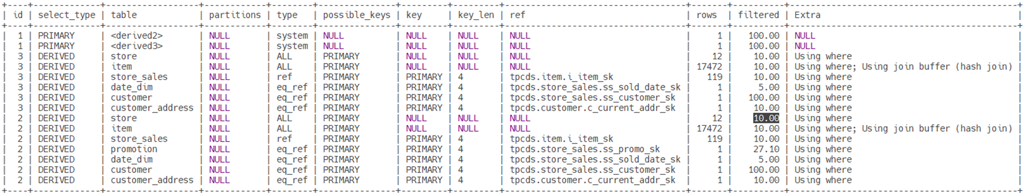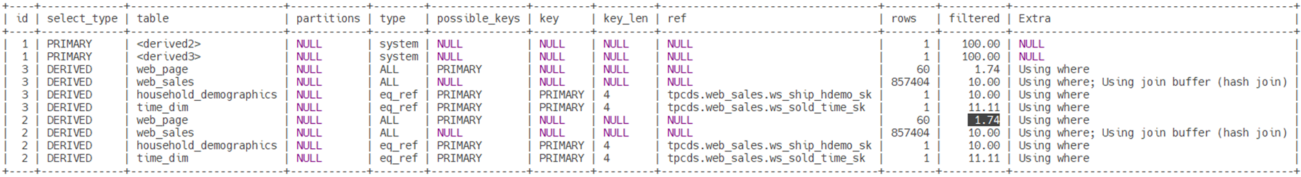 | id | select_type | table | partitions | type | possible_keys | key | key_len | ref | rows | filtered | Extra |