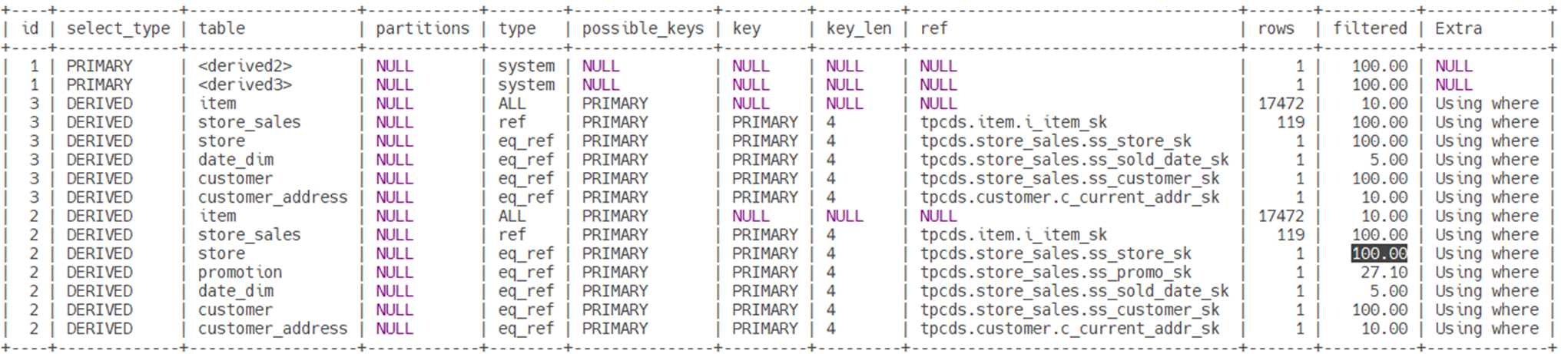 我们此次使用Aurora MySQL 3.05.02 版本的 r7g.large 实例类型上,采用 scale factor 为 1 的 TPC-DS 数据集(整体数据库规模 1GB)进行测试。集群采用默认的参数组,该实例类型默认可用的buffer pool空间约8GB,此次测试中所有数据集驻留在 buffer pool 中。下面将通过 TPC-DS 中的两个查询,直观展示直方图对查询执行计划的优化影响。