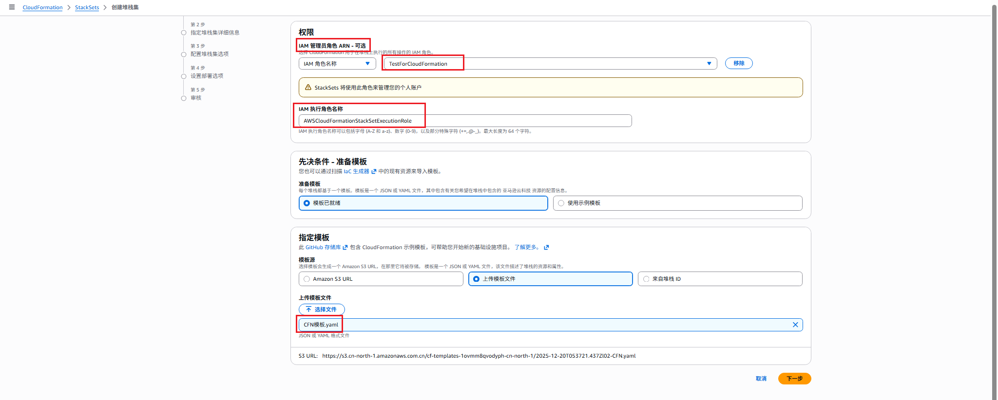 4. IAM管理员角色ARN,选择步骤1中创建的Amazon IAM角色,“IAM执行角色名称”填写步骤2中创建的Amazon IAM角色名称,选择上传示例模板,或使用Amazon S3 URL提供模板。