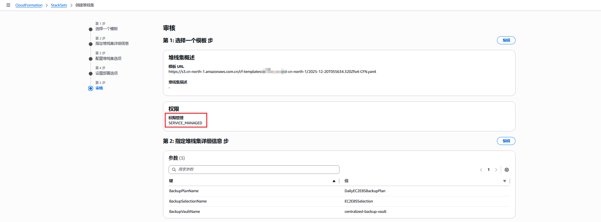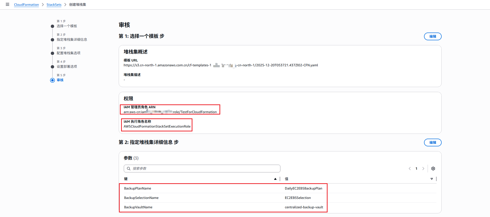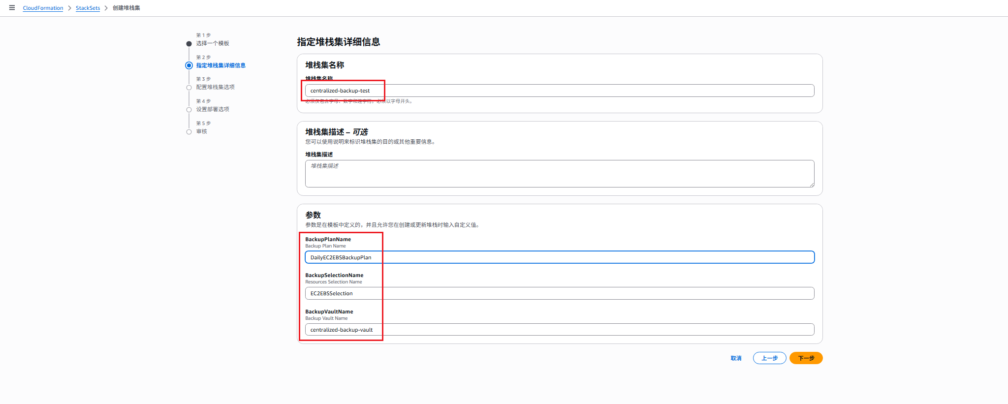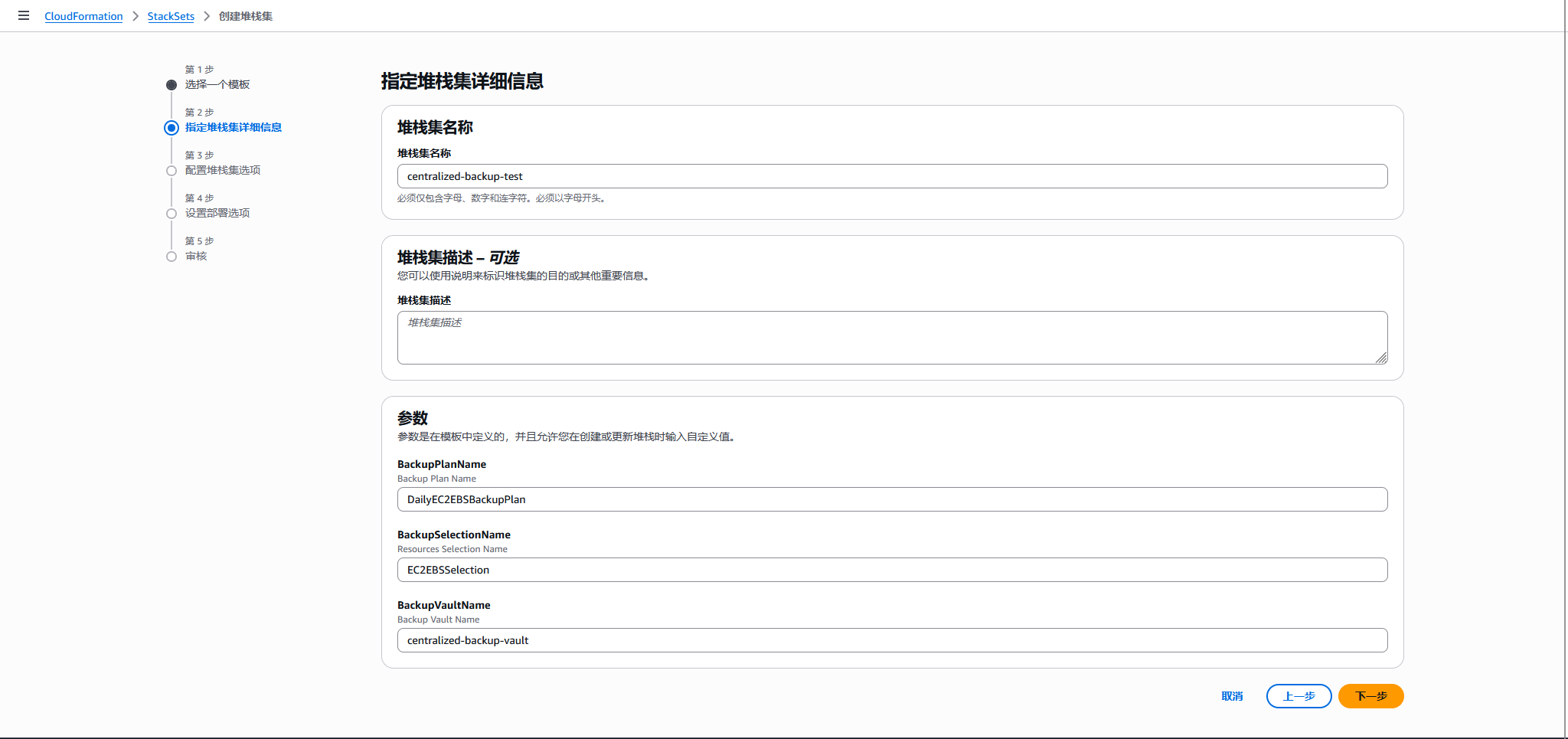5. 填写堆栈集名称,指定示例模板需要的参数,如果BackupVaultName有修改,需要对应调整步骤2中的权限策略。