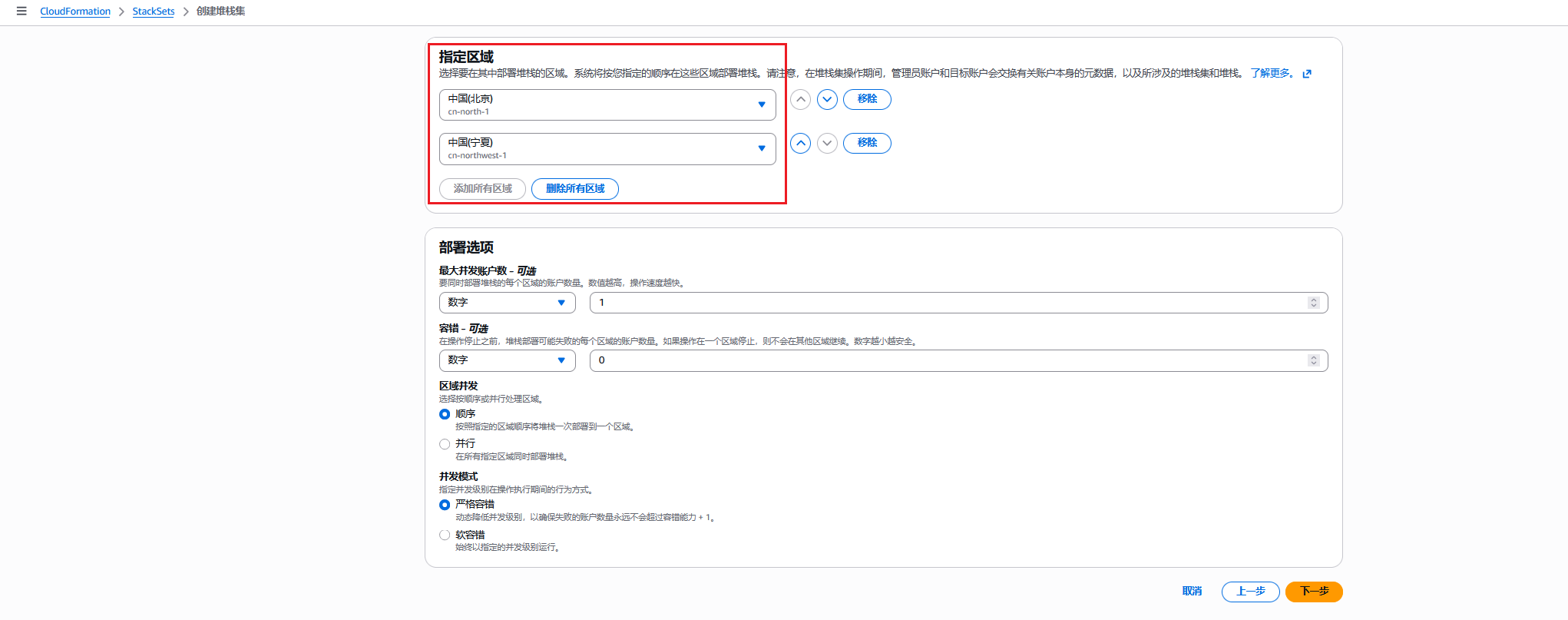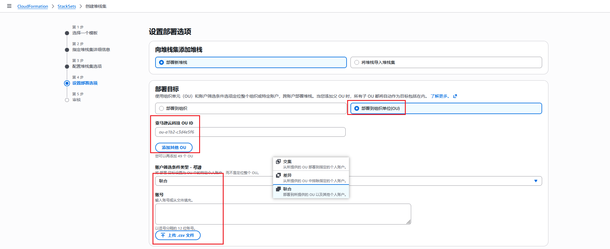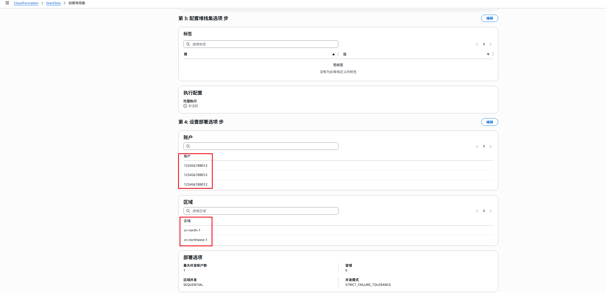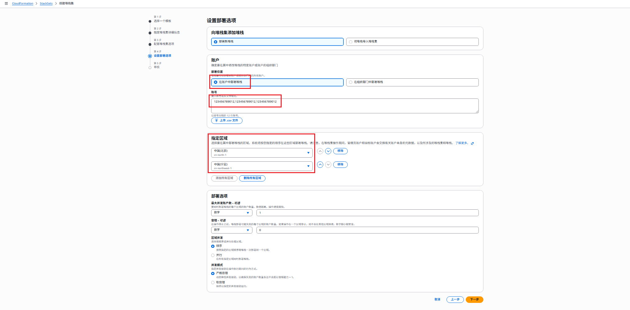 7. 若选择“在组织部门中部署堆栈”,则需要特定的组织部门编号OU;若选择“在账户中部署堆栈”,则需提供所有账号ID,以后者为例。根据需要选择部署的区域以及部署选项。