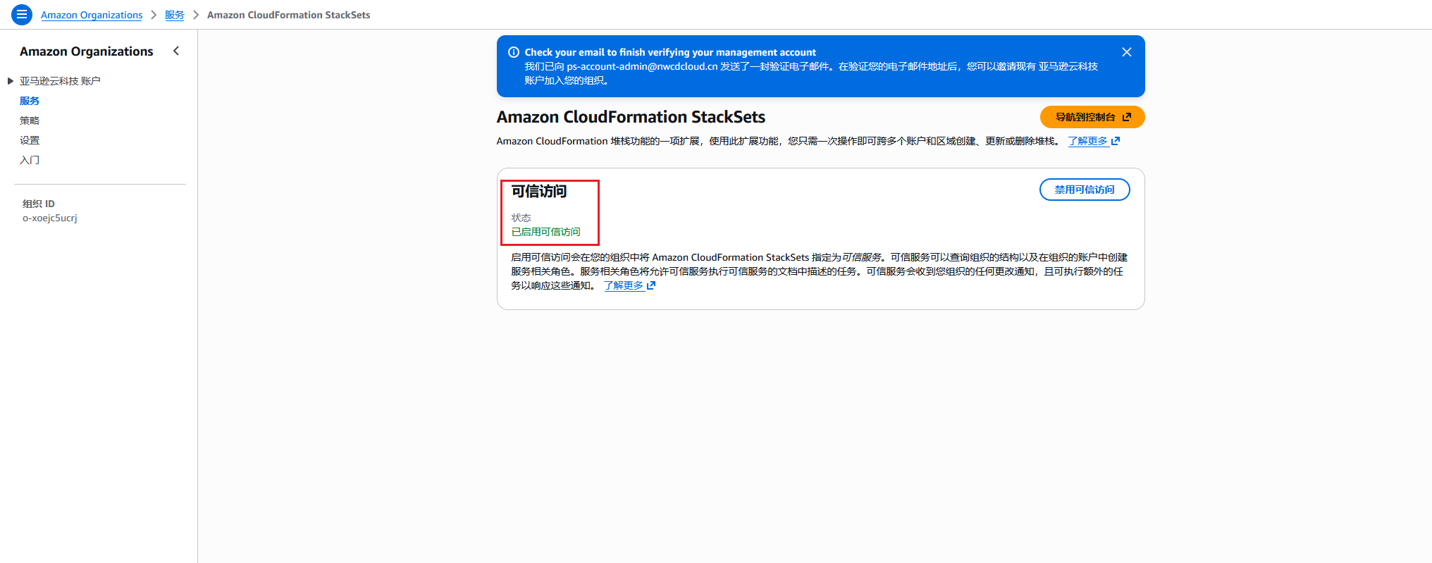 前提条件:Amazon Organizations服务启用完整功能,并确保在该服务中启用Amazon CloudFormation Stacksets的可信访问。