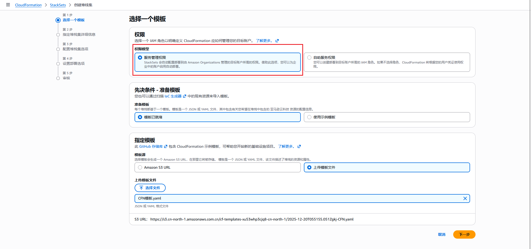 2. 选择“服务管理权限”,选择上传示例模板,或使用Amazon S3 URL提供模板。