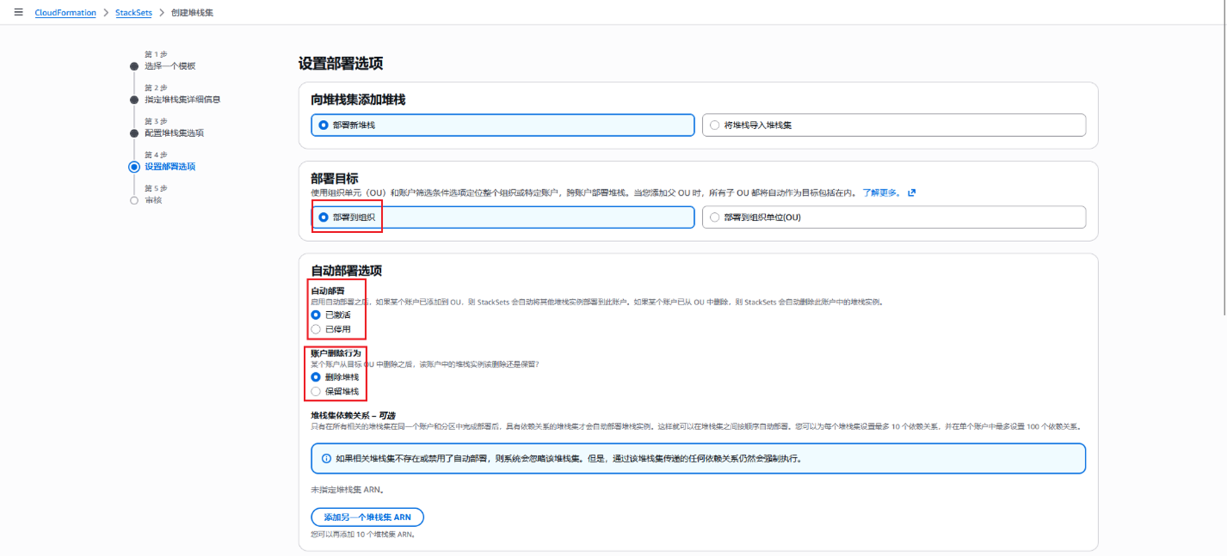 4. 部署目标为“部署到组织”时,将会为组织内所有账号部署堆栈,部署目标为“部署到组织单位(OU)”时,则需要提供OU ID,也可以同时提供账户列表,并选择“账户筛选条件类型”(交集、差异、联合);自动部署选项可根据需求设置,