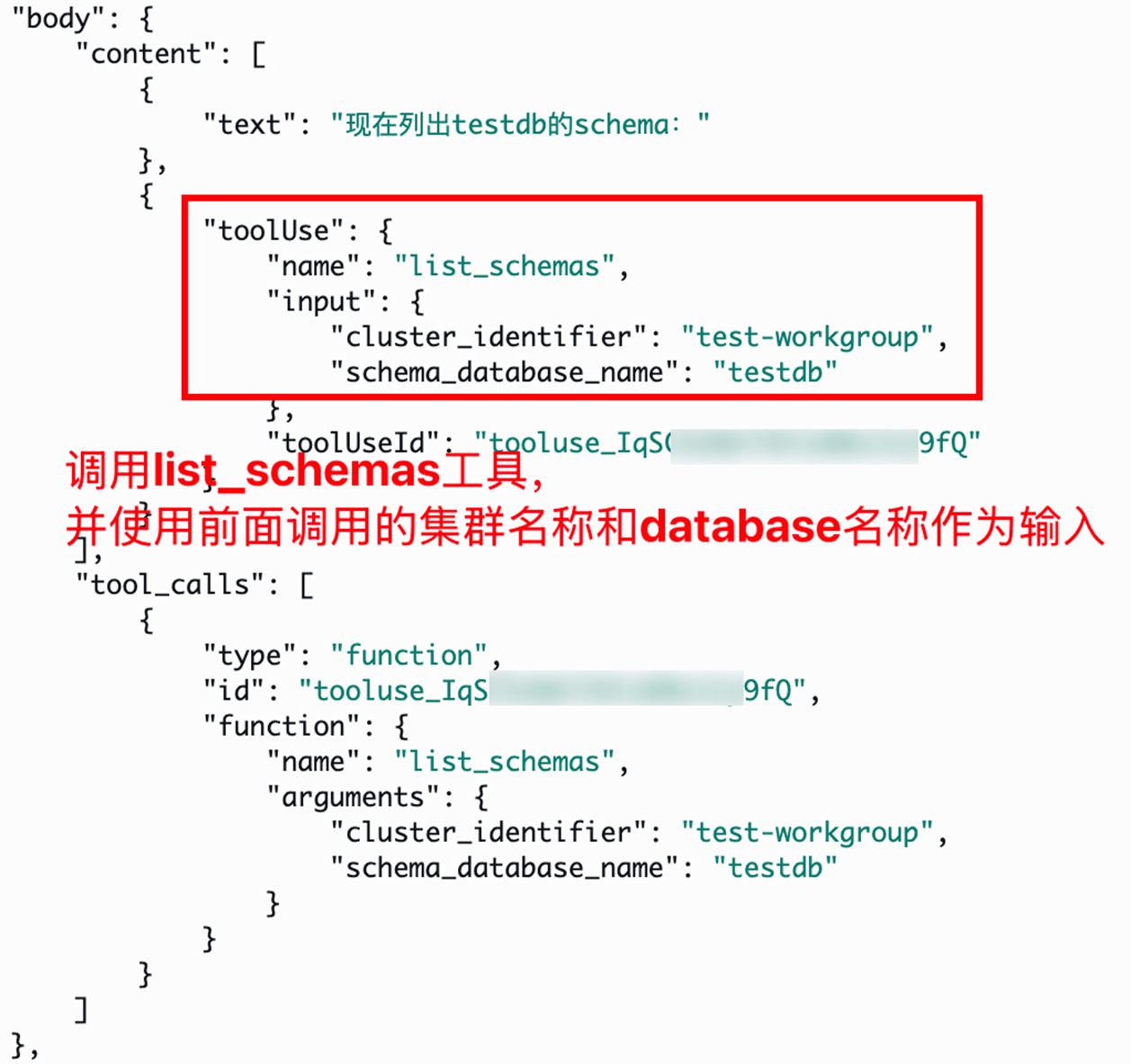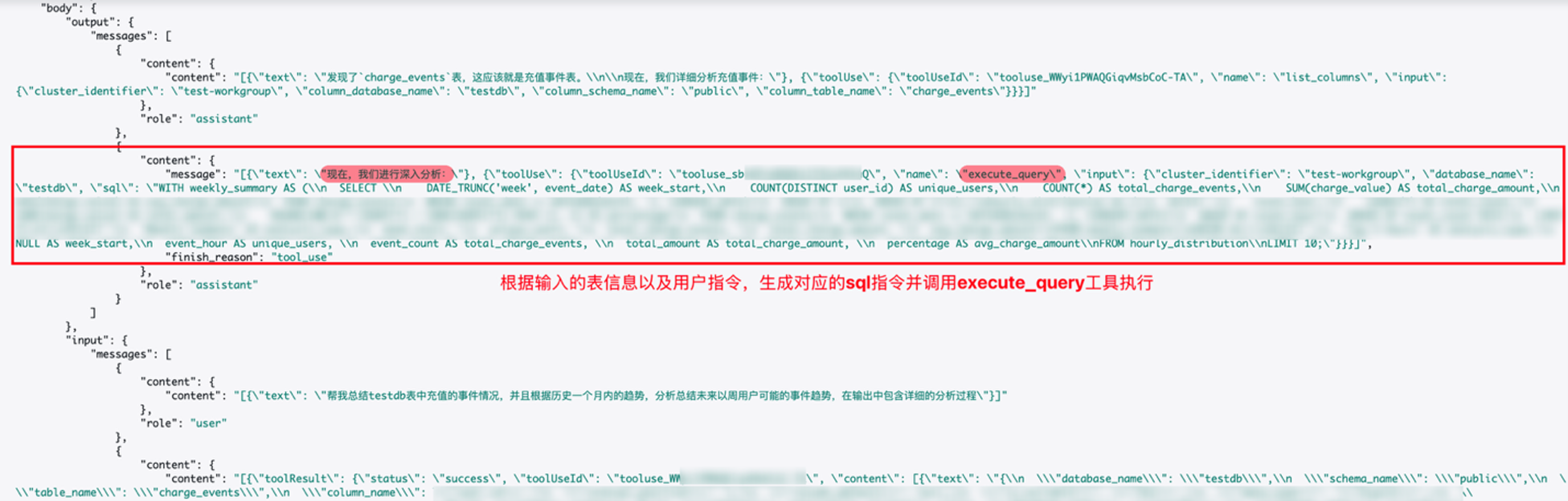 上述测试方式中显式声明了具体需要查询数据库的名称,这是因为数据库名称为testdb,定义不明确,建议在生产环境中使用与业务紧密相关的数据库/表名称,或通过注释声明,或在系统提示词中添加定义以减少工具调用次数并且提高准确率。同时,我们在提示词中没有声明具体需要查询的表,因为表名称定义清晰,在下面的日志内容分析中可以更加清楚的看到Redshift MCP Server的工具调用过程中,AI可以明确的找到所需要的charge_events表。